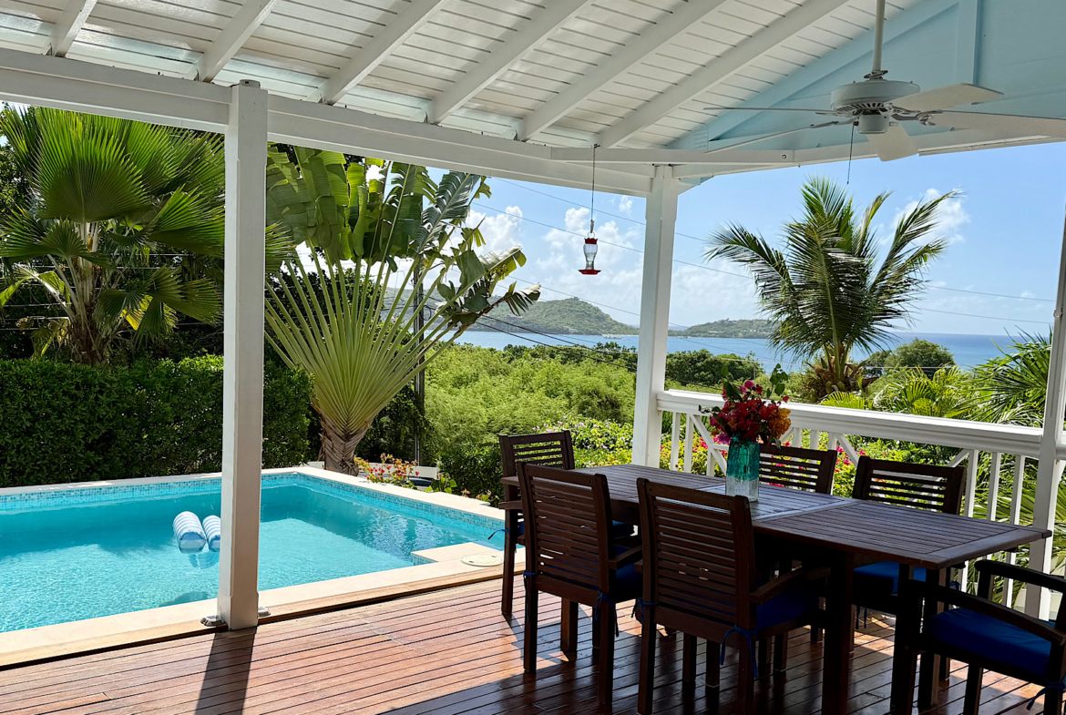 Almond Tree House is located in the much sought after residential community of Roses Estate, just a few minutes drive from World Heritage location of English Harbour, with its local supermarkets, restaurants, museum and the marinas, and the nearby white sand beaches at Pigeon Point and Galleon Beach. A short drive uphill from the main road access to English Harbour brings you to Almond Tree House. There’s a gate code entry taking you to a few steps up to the entrance and leading into the living area incorporating kitchen, lounge and indoor dining. The doors open up and fold back to open a covered deck and pool deck offering the best of Caribbean indoor outdoor living.