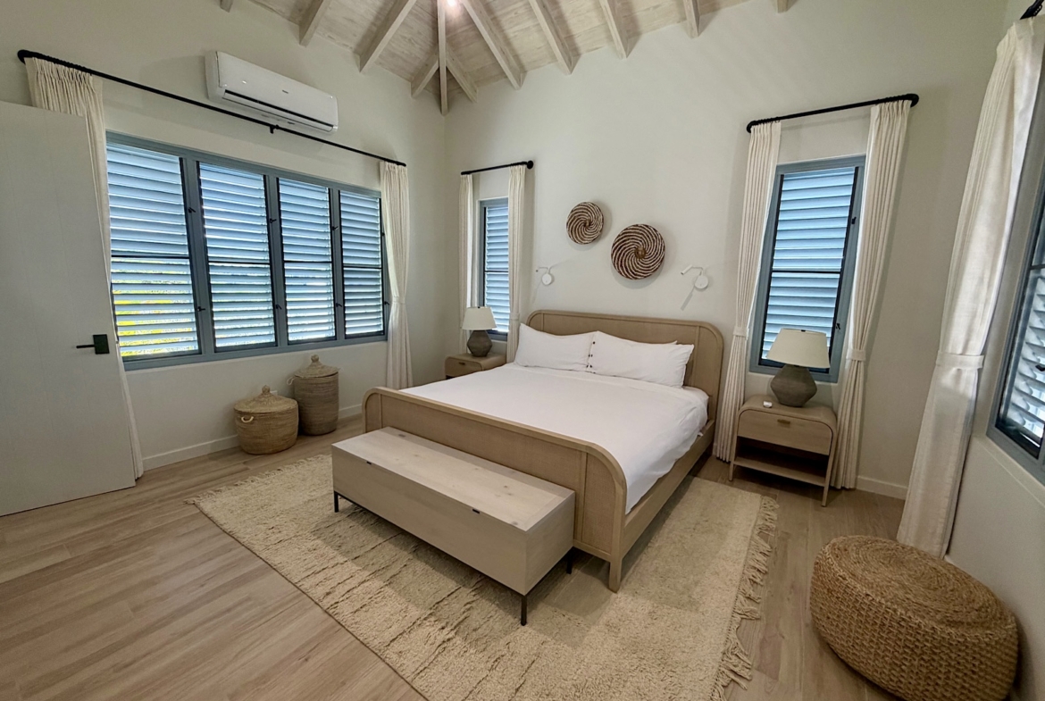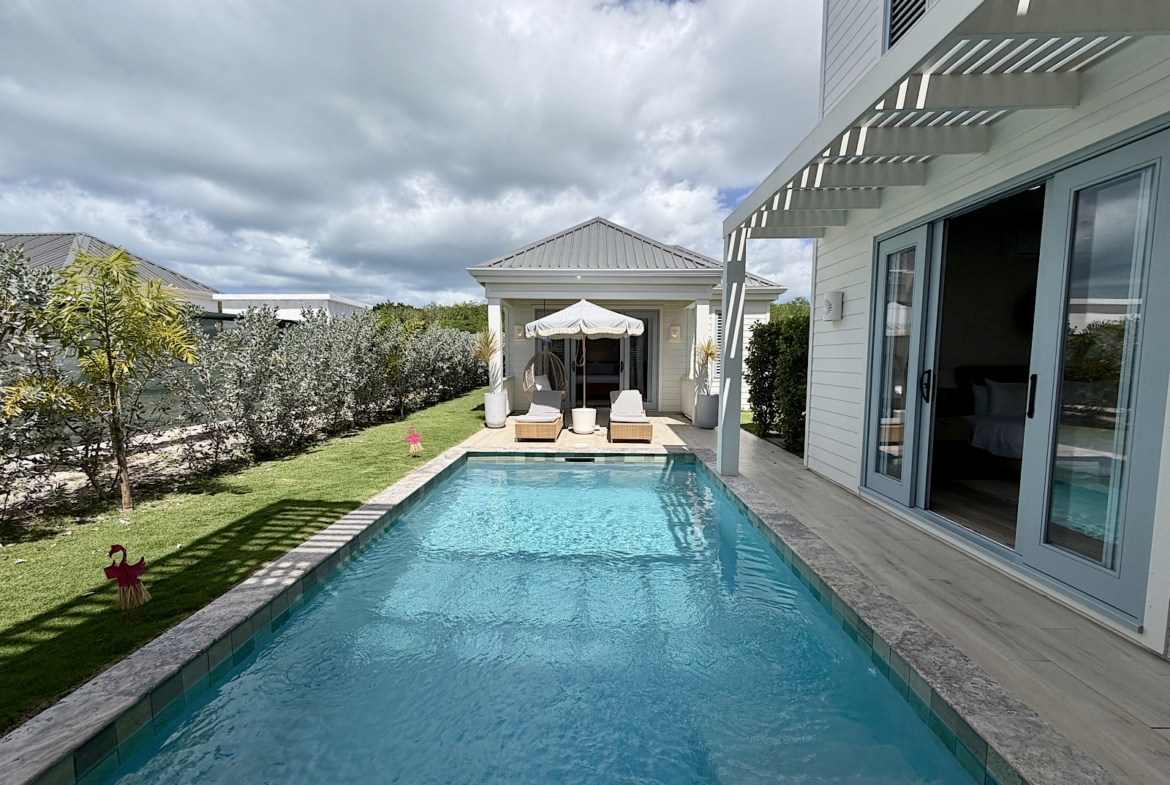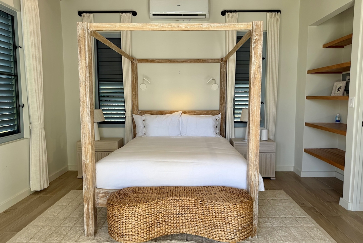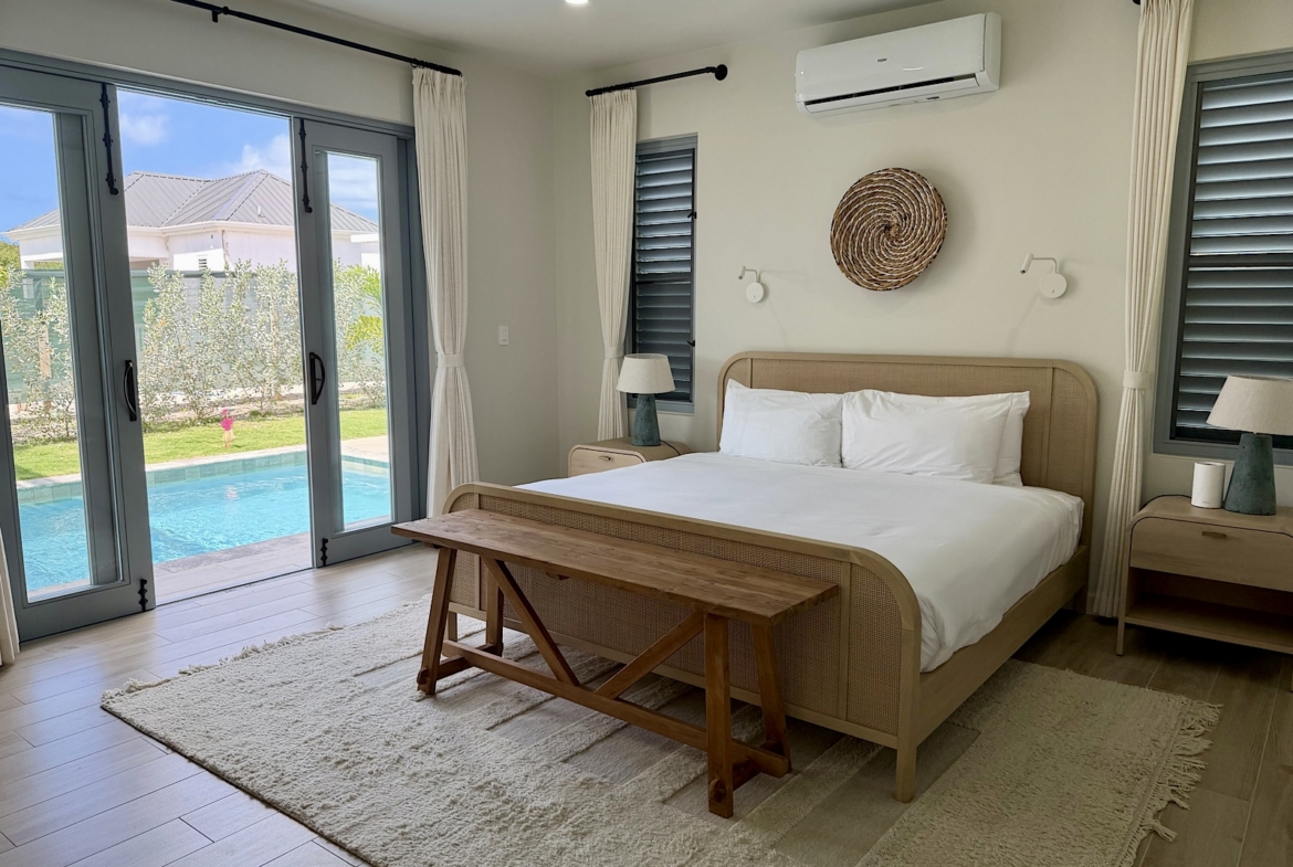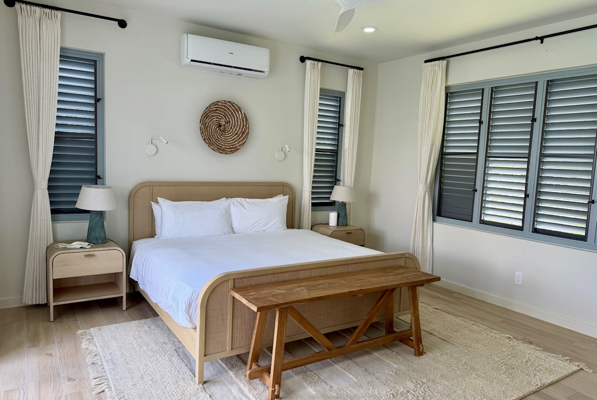 All on one level, this recently completed luxury home, offers space privacy and comfort and wonderful vacation home setting for up to six persons. The open plan central living area of the home epitomises Caribbean style indoor outdoor living with fully fitted kitchen and central island, spacious lounge area with large screen smart TV, and glass sliding doors leading out to a covered dining terrace with L shaped sofa and dining space for up to eight persons, poolside. There’s a pool shower for rinsing off and cleaning sandy feet before going into the pool. There are two bedrooms (one king size and one queen size bed) in the main house located at either end of the home, both with ceiling fans, air conditioning and en suite shower rooms. There’s a lovely poolside guest cottage complete with queen size four poster bed and en-suite bathroom, ceiling fans and air conditioning.