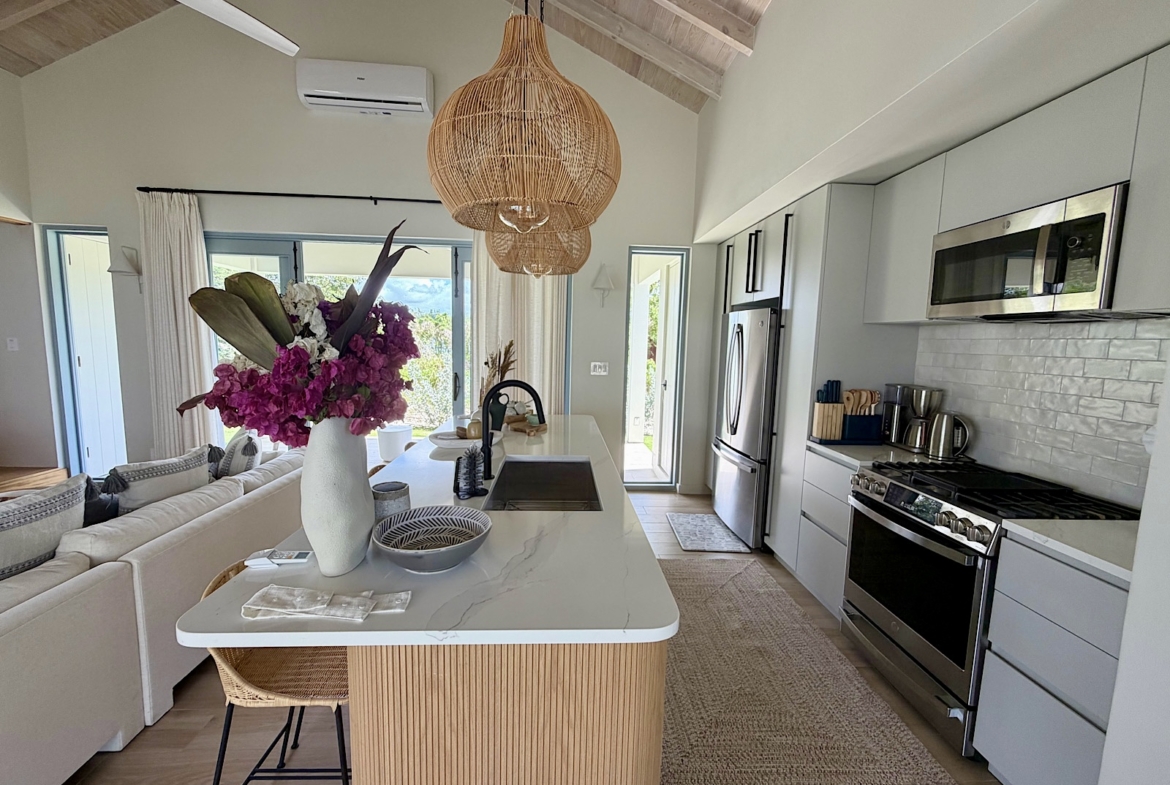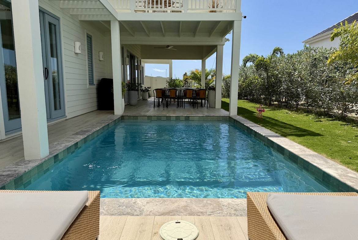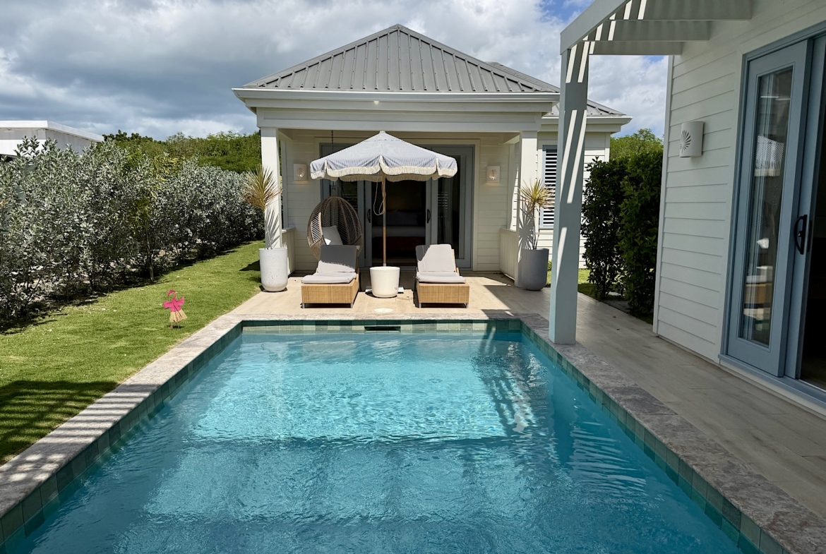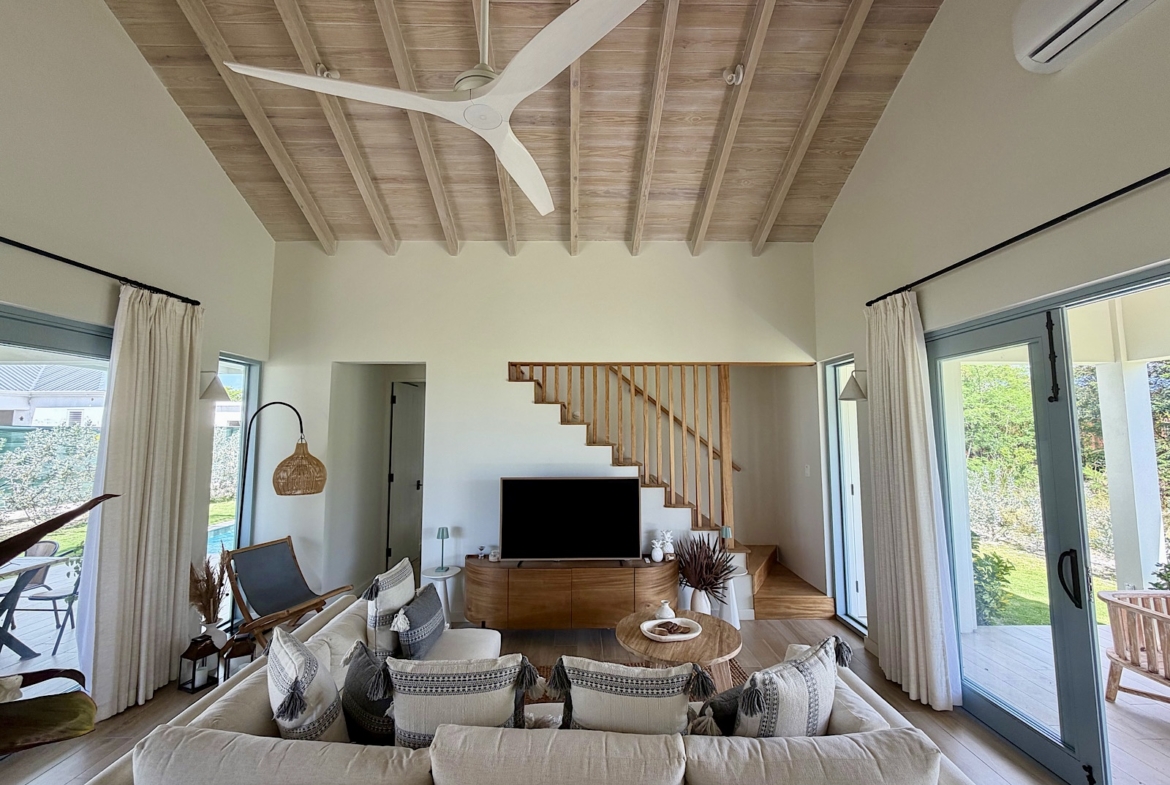 All on one level, this recently completed luxury home, offers space privacy and comfort and wonderful vacation home setting for up to six persons. The open plan central living area of the home epitomises Caribbean style indoor outdoor living with fully fitted kitchen and central island, spacious lounge area with large screen smart TV, and glass sliding doors leading out to a covered dining terrace with L shaped sofa and dining space for up to eight persons, poolside. There’s a pool shower for rinsing off and cleaning sandy feet before going into the pool. There are two bedrooms (one king size and one queen size bed) in the main house located at either end of the home, both with ceiling fans, air conditioning and en suite shower rooms. There’s a lovely poolside guest cottage complete with queen size four poster bed and en-suite bathroom, ceiling fans and air conditioning.