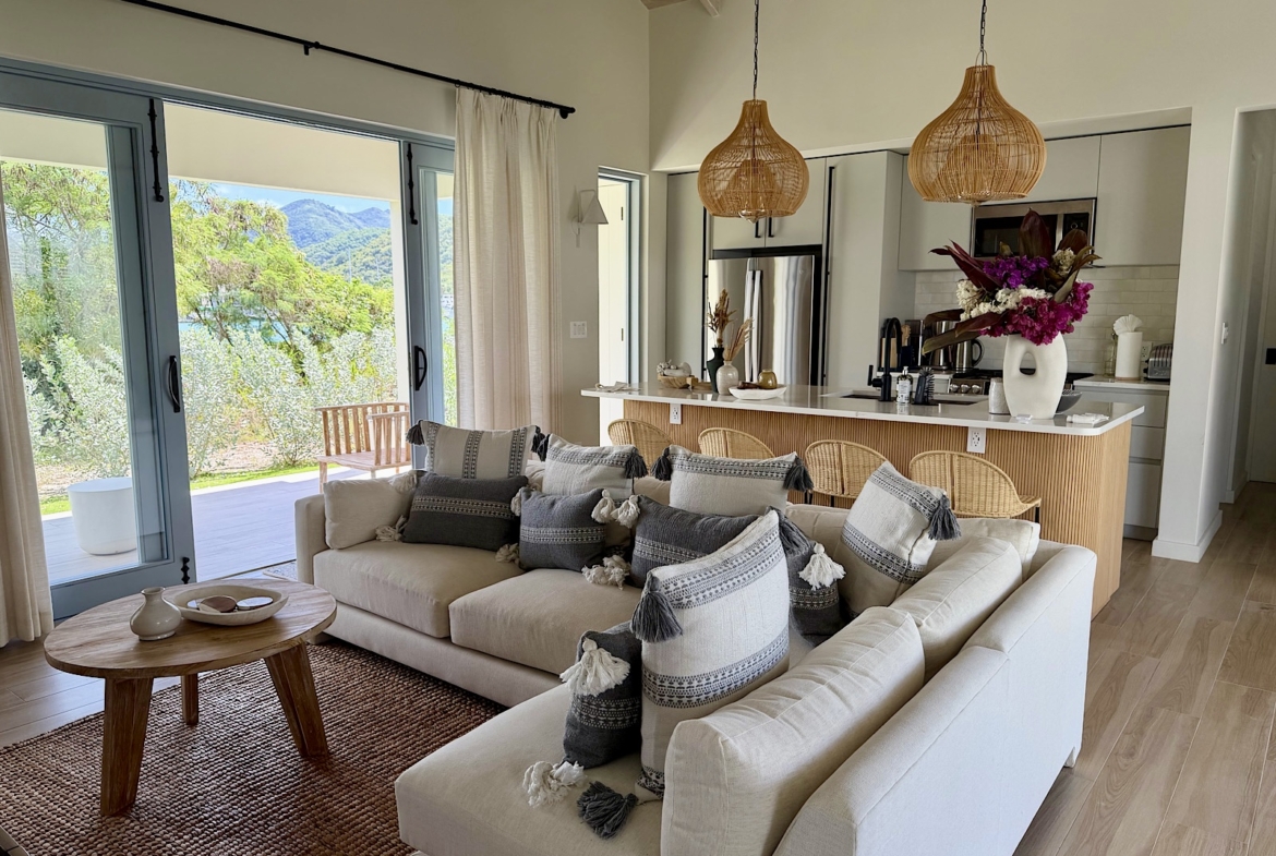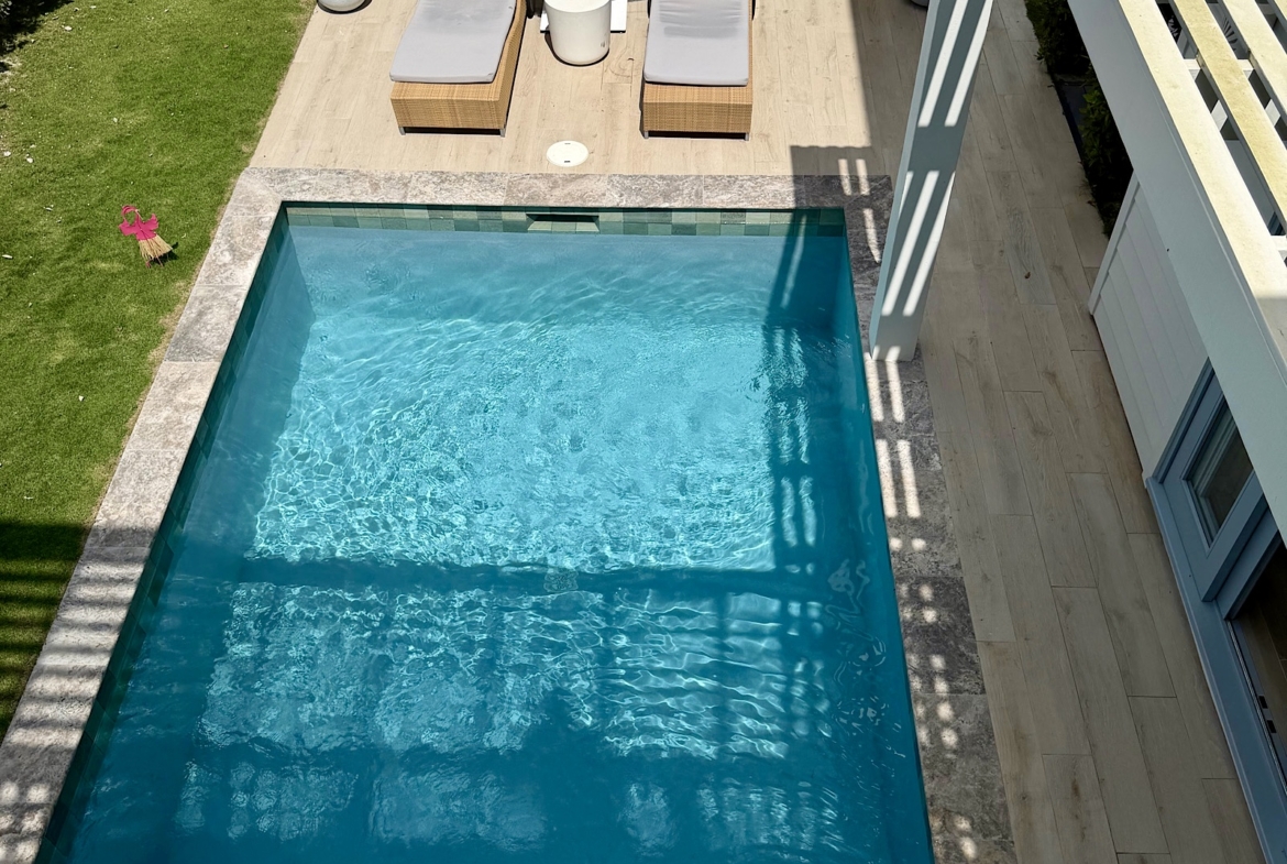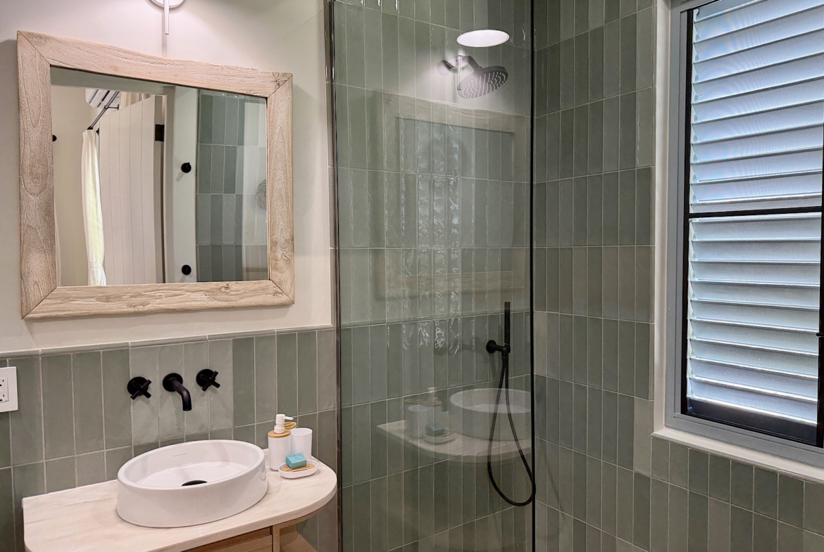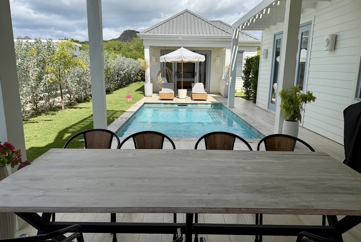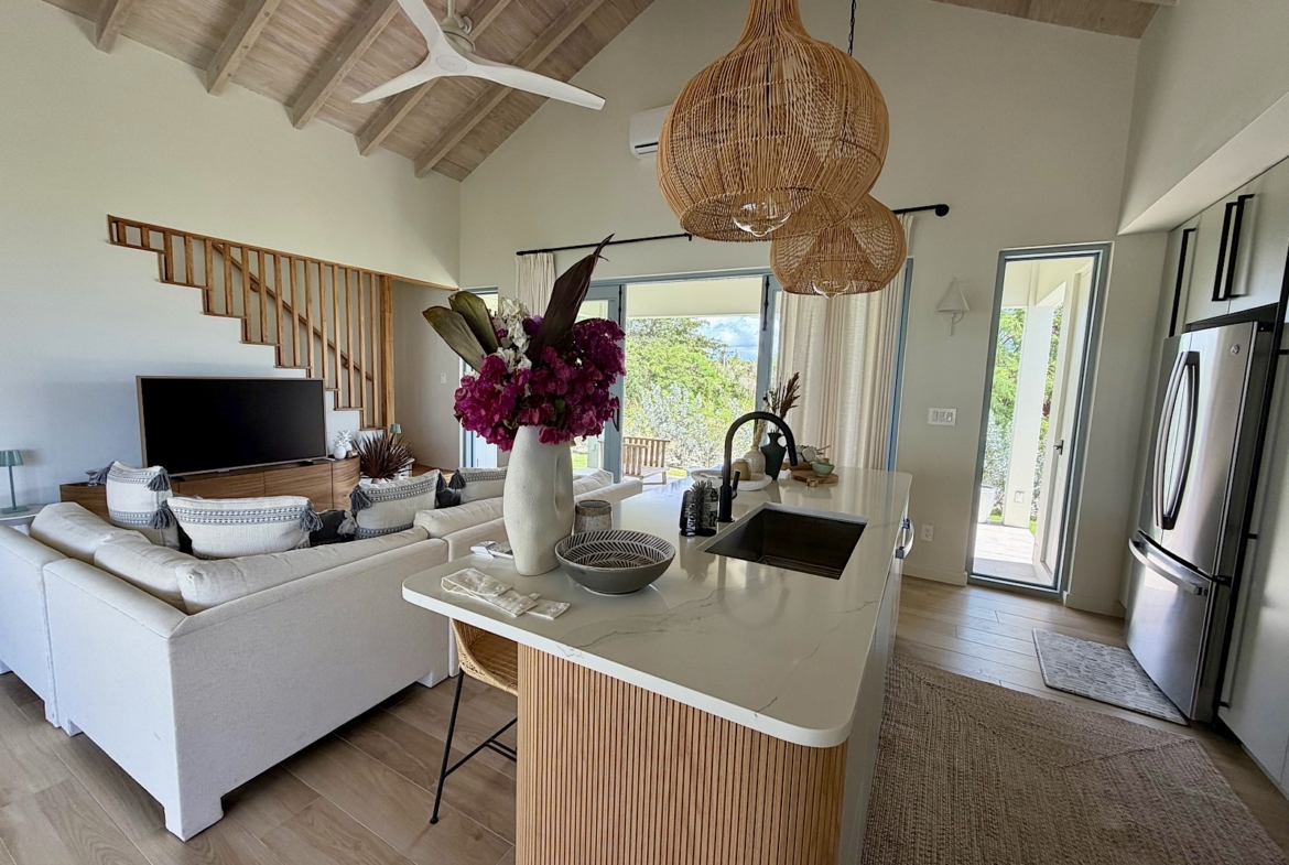 All on one level, this recently completed luxury home, offers space privacy and comfort and wonderful vacation home setting for up to six persons. The open plan central living area of the home epitomises Caribbean style indoor outdoor living with fully fitted kitchen and central island, spacious lounge area with large screen smart TV, and glass sliding doors leading out to a covered dining terrace with L shaped sofa and dining space for up to eight persons, poolside. There’s a pool shower for rinsing off and cleaning sandy feet before going into the pool. There are two bedrooms (one king size and one queen size bed) in the main house located at either end of the home, both with ceiling fans, air conditioning and en suite shower rooms. There’s a lovely poolside guest cottage complete with queen size four poster bed and en-suite bathroom, ceiling fans and air conditioning.
