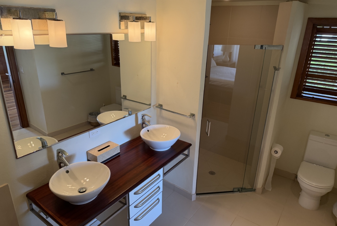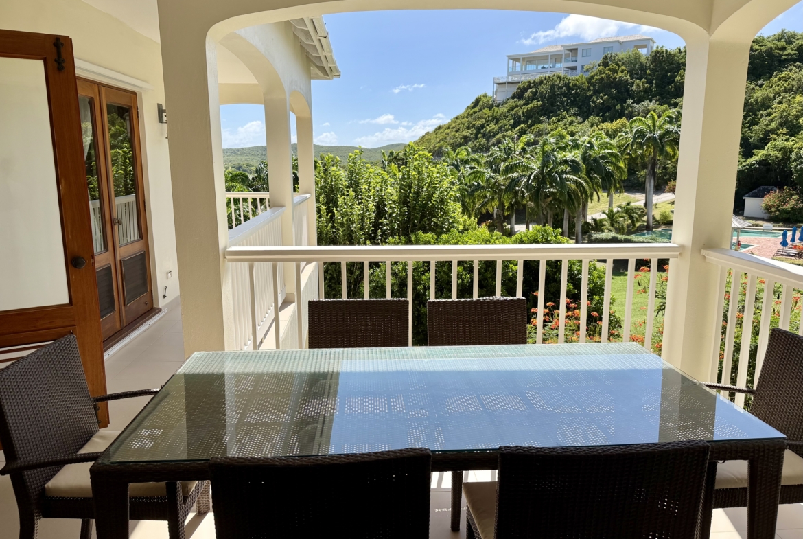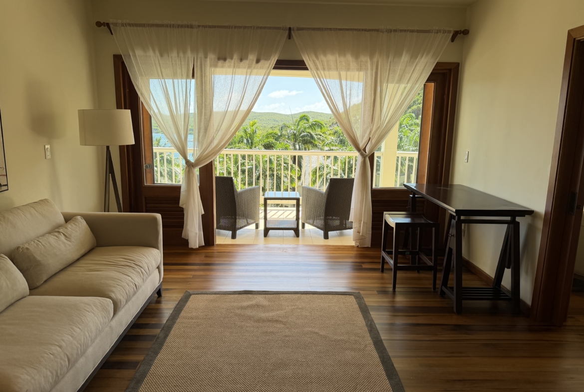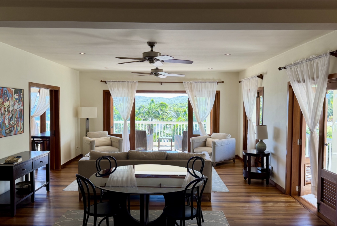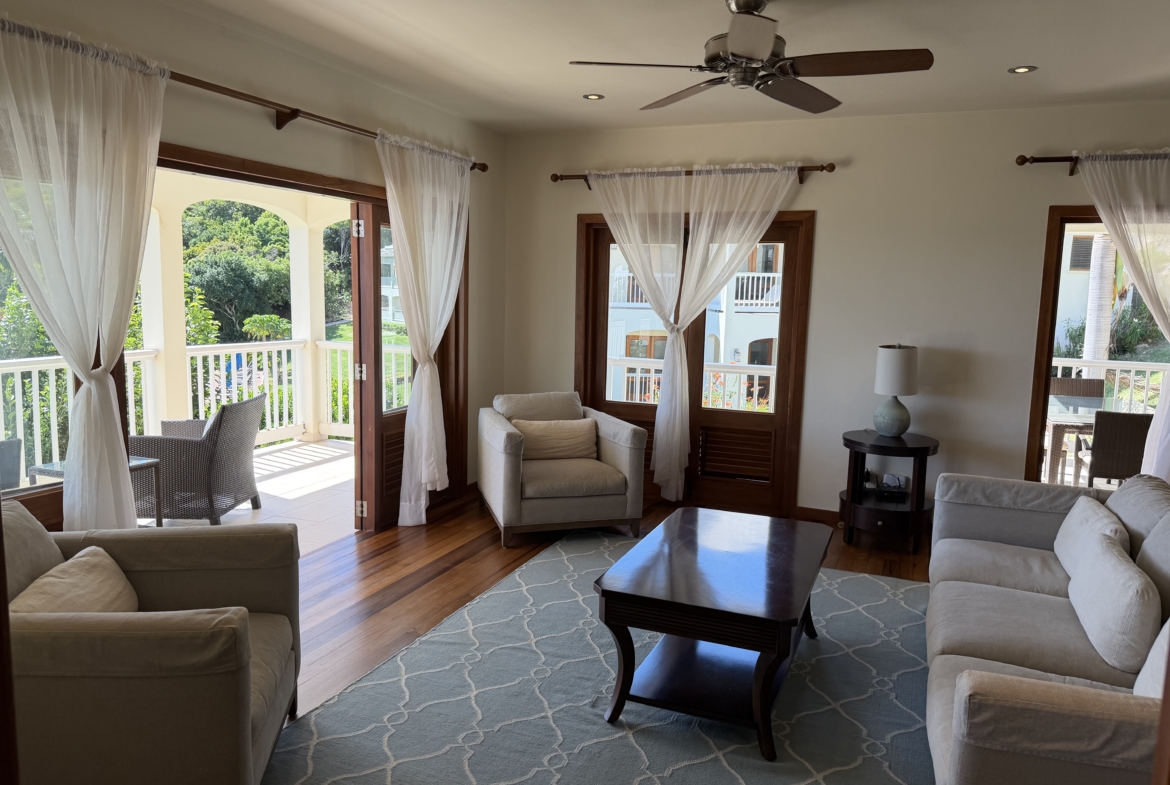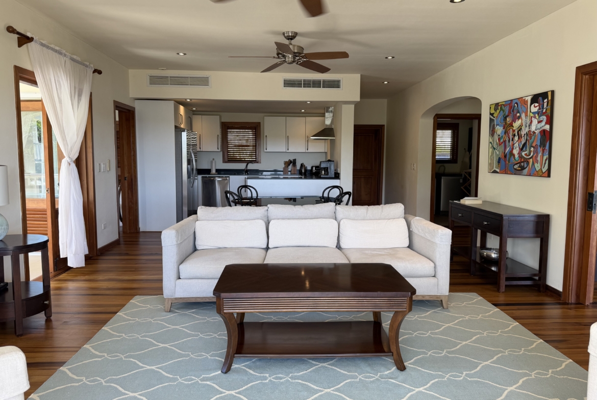 Ideally situated near the upper pool with a landscaped garden in front, the apartment provides a modern open and spacious living/dining areas and fully equipped kitchen with stainless steel appliances, as well as the expansive verandah set up for outside dining and lounging – perfect for relaxing or entertaining. Central air conditioning, purple heart floors, soaring ceilings, large closets, commodious baths, high end appliances and included Anglo-Indian style furnishings are some of the copious amenities.