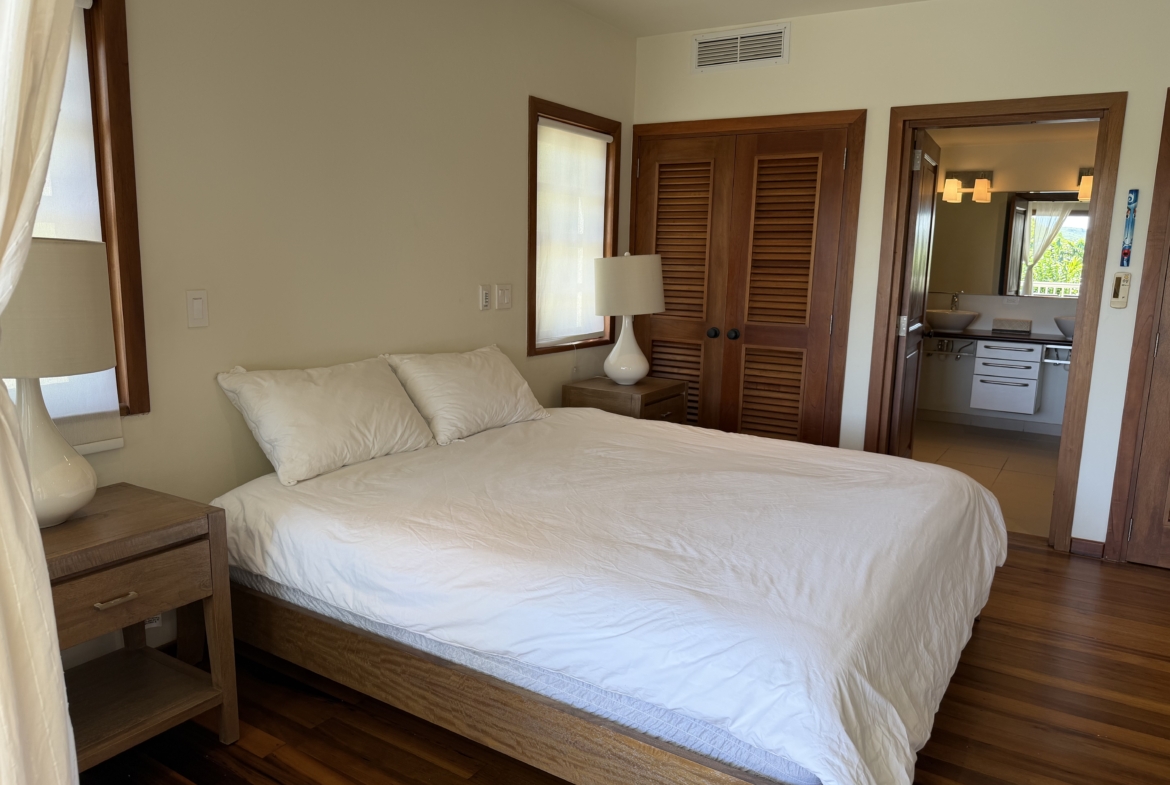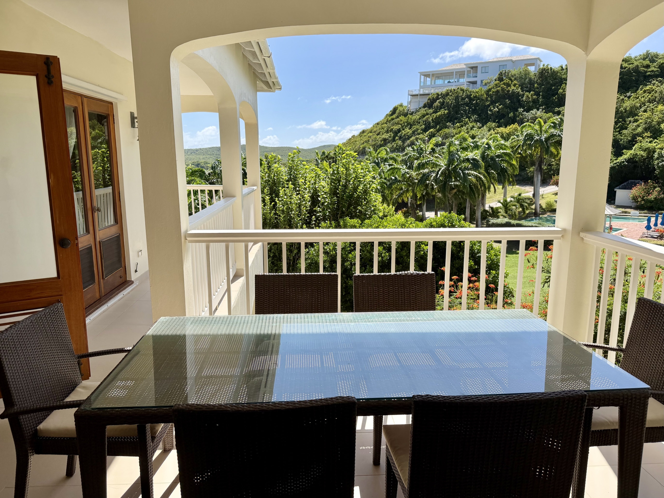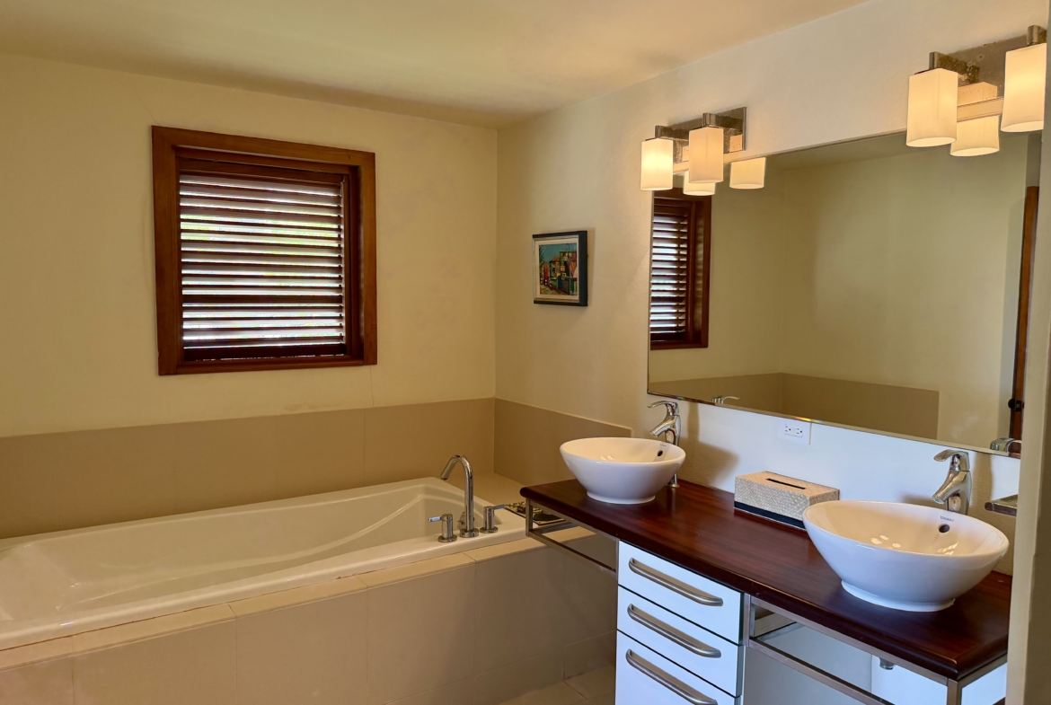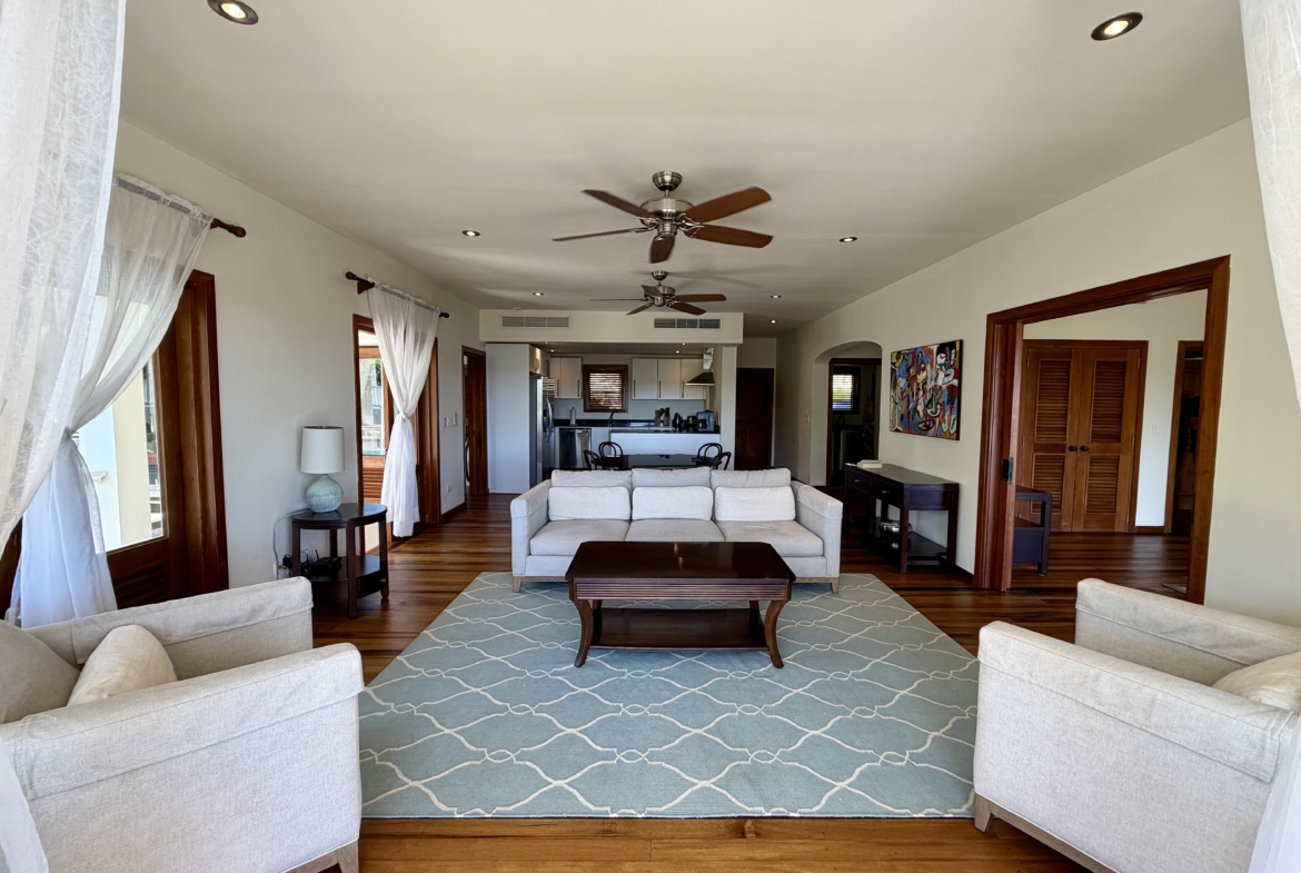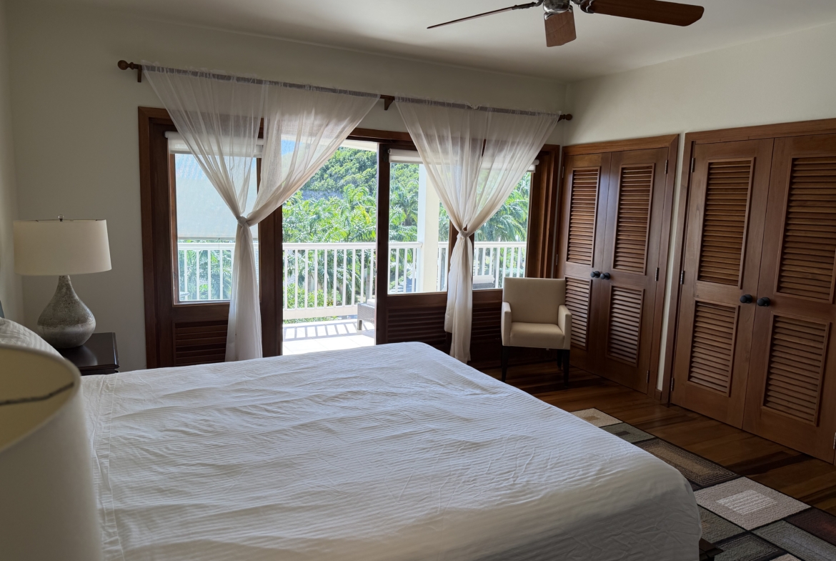 Ideally situated near the upper pool with a landscaped garden in front, the apartment provides a modern open and spacious living/dining areas and fully equipped kitchen with stainless steel appliances, as well as the expansive verandah set up for outside dining and lounging – perfect for relaxing or entertaining. Central air conditioning, purple heart floors, soaring ceilings, large closets, commodious baths, high end appliances and included Anglo-Indian style furnishings are some of the copious amenities.