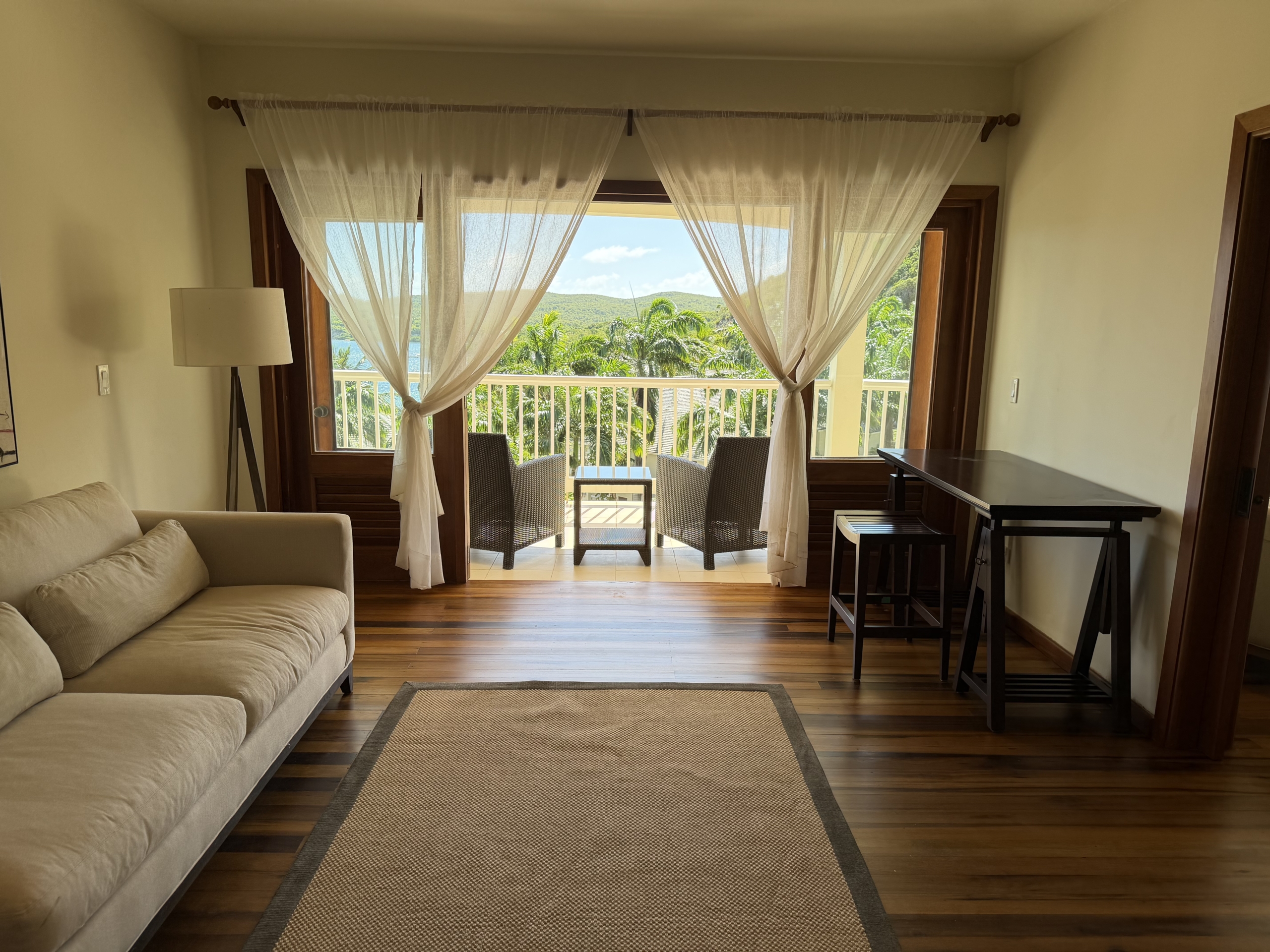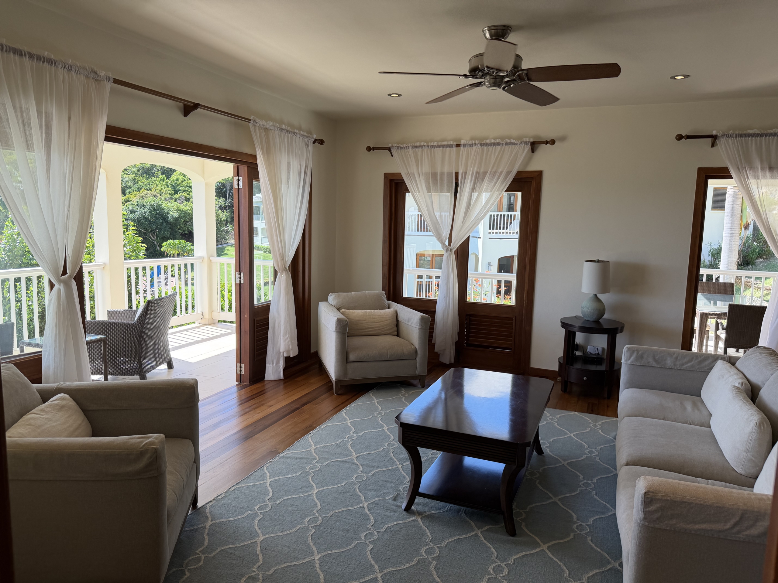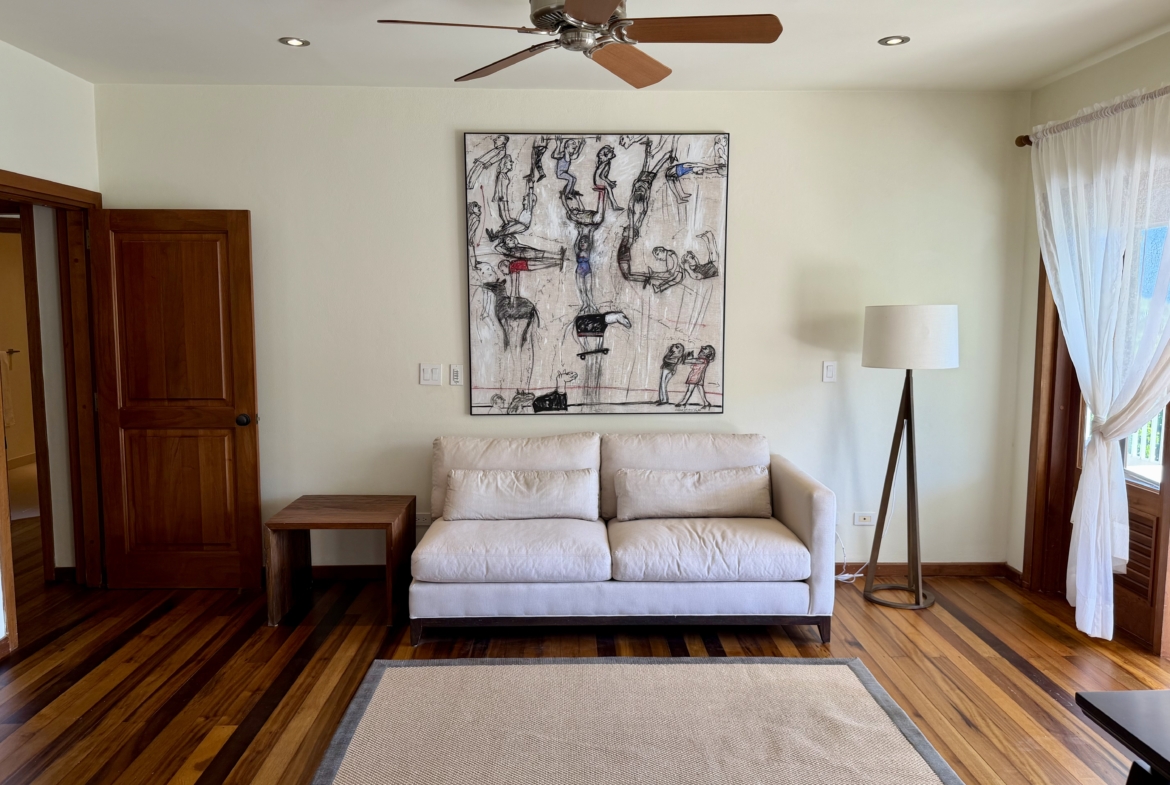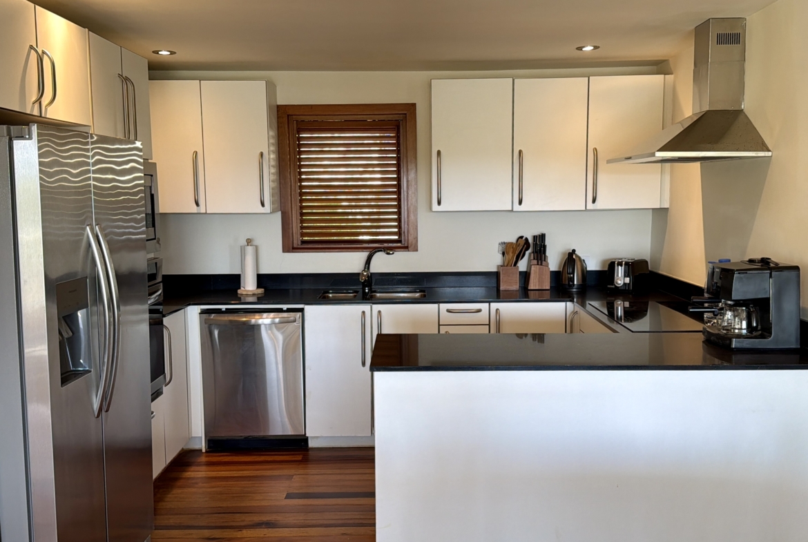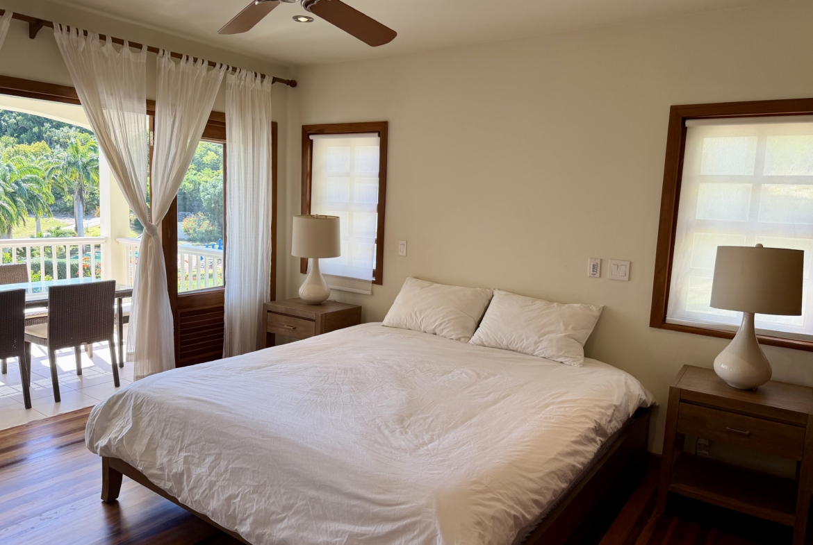 Ideally situated near the upper pool with a landscaped garden in front, the apartment provides a modern open and spacious living/dining areas and fully equipped kitchen with stainless steel appliances, as well as the expansive verandah set up for outside dining and lounging – perfect for relaxing or entertaining. Central air conditioning, purple heart floors, soaring ceilings, large closets, commodious baths, high end appliances and included Anglo-Indian style furnishings are some of the copious amenities.