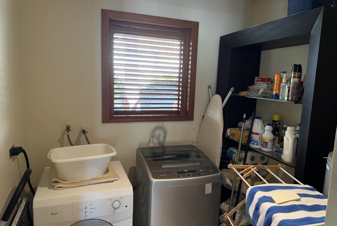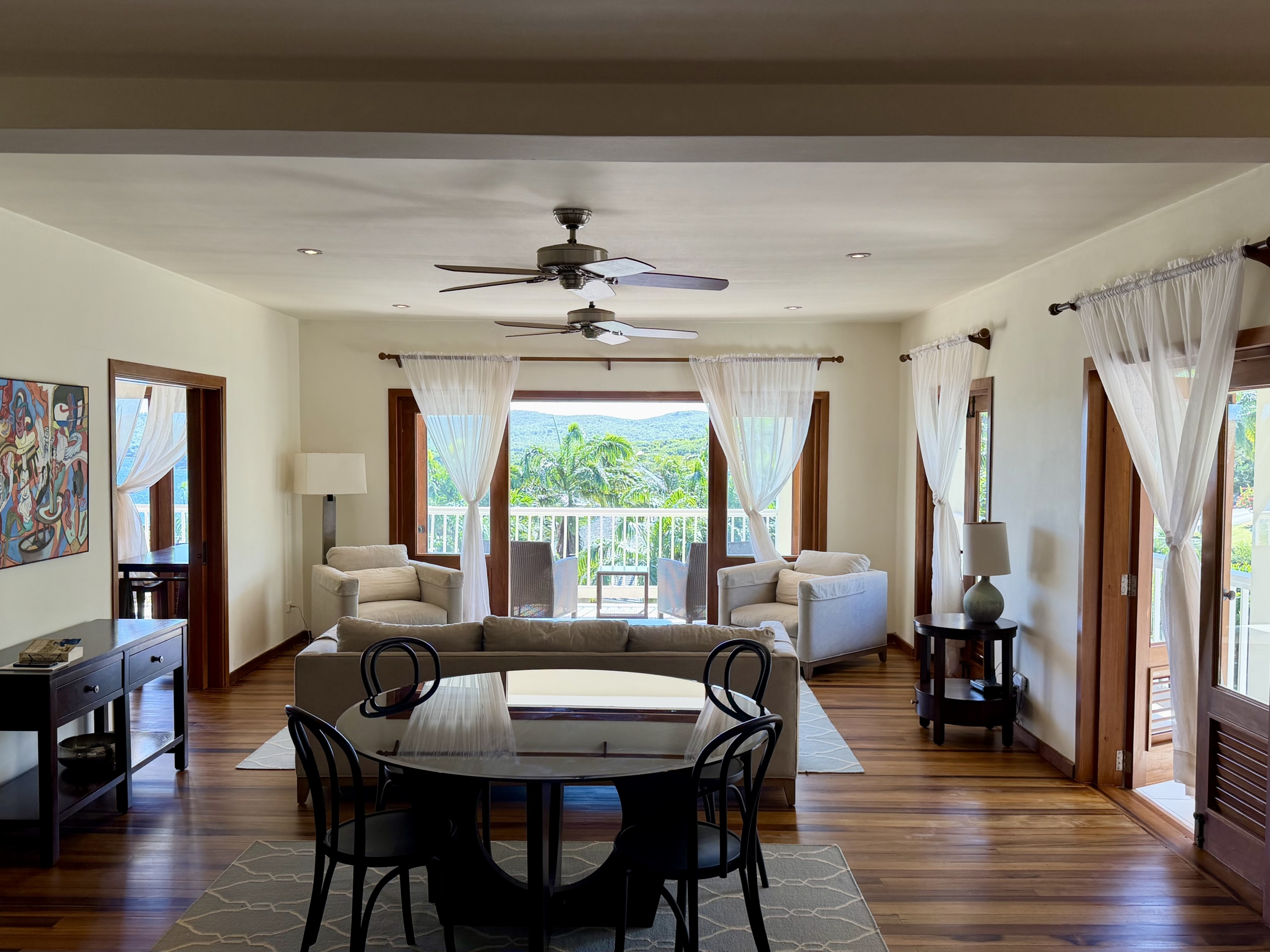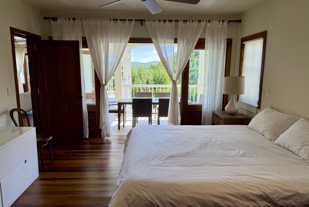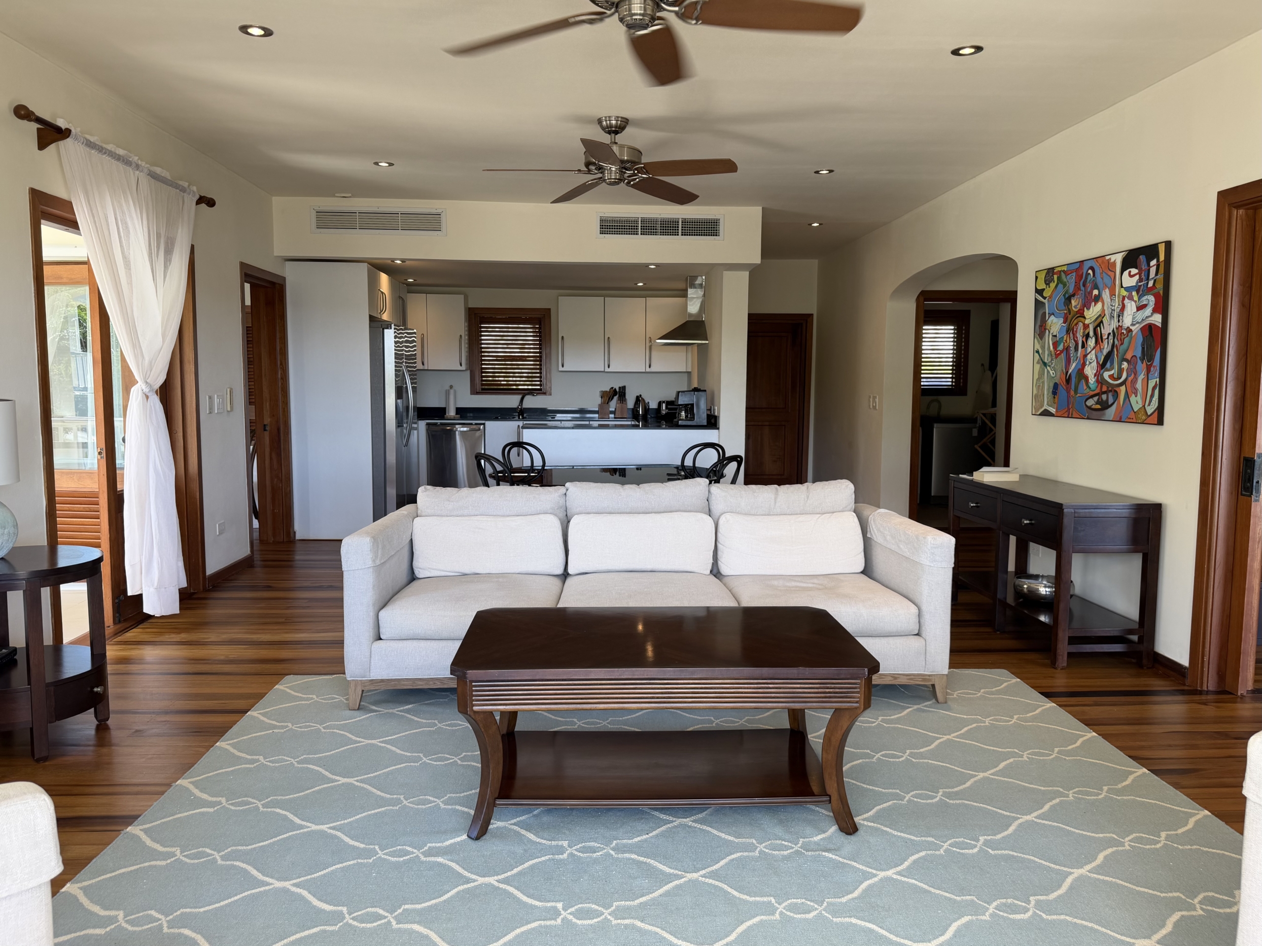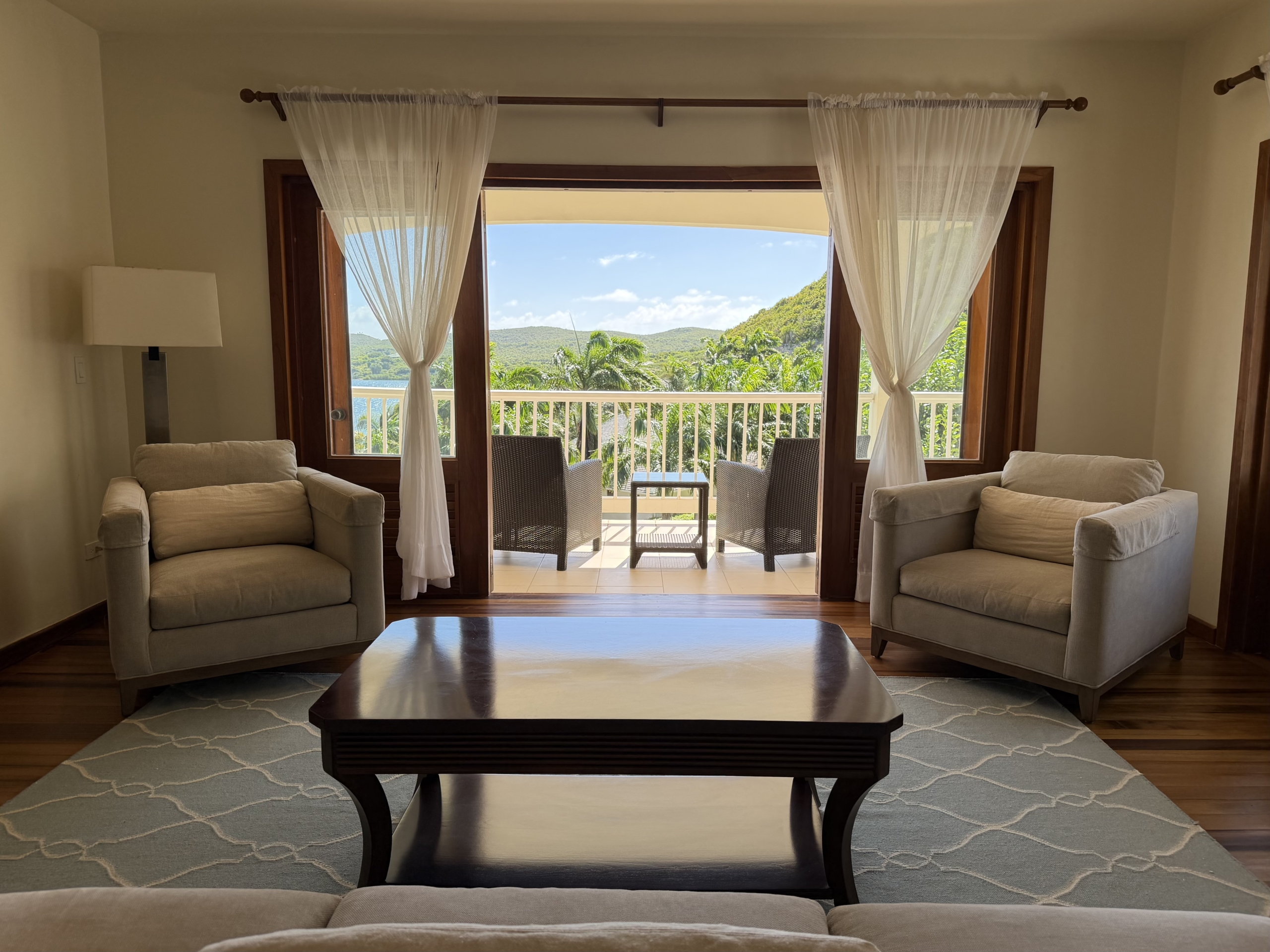 Ideally situated near the upper pool with a landscaped garden in front, the apartment provides a modern open and spacious living/dining areas and fully equipped kitchen with stainless steel appliances, as well as the expansive verandah set up for outside dining and lounging – perfect for relaxing or entertaining. Central air conditioning, purple heart floors, soaring ceilings, large closets, commodious baths, high end appliances and included Anglo-Indian style furnishings are some of the copious amenities.