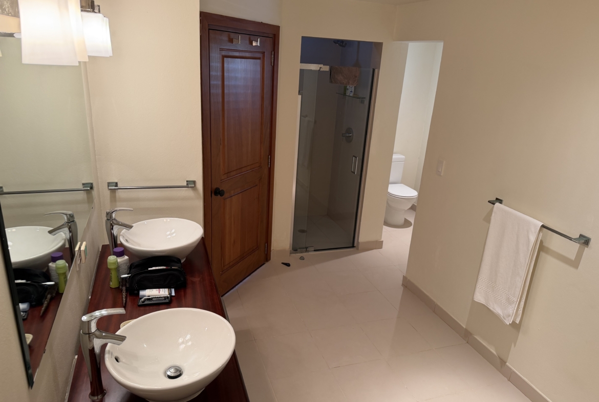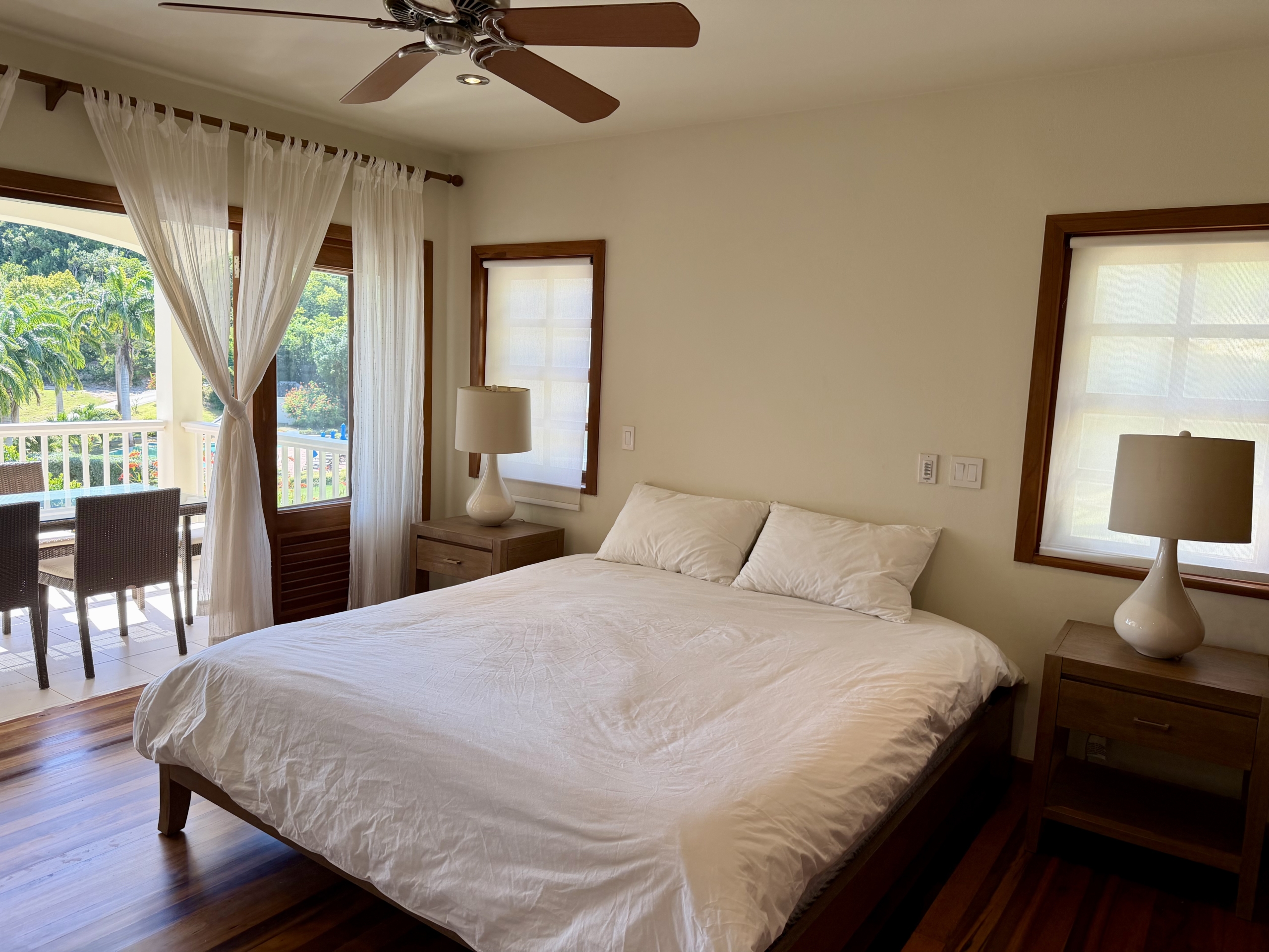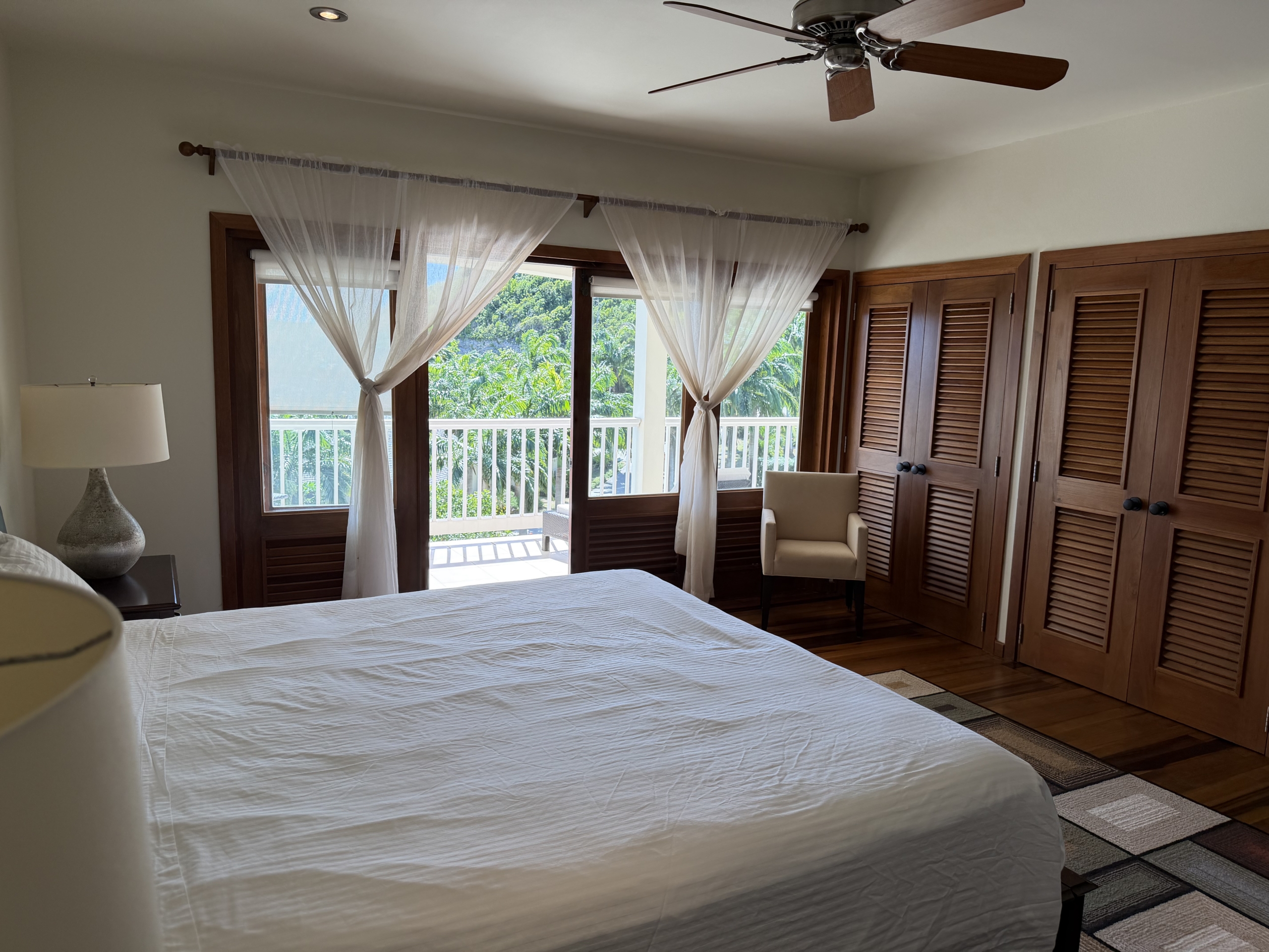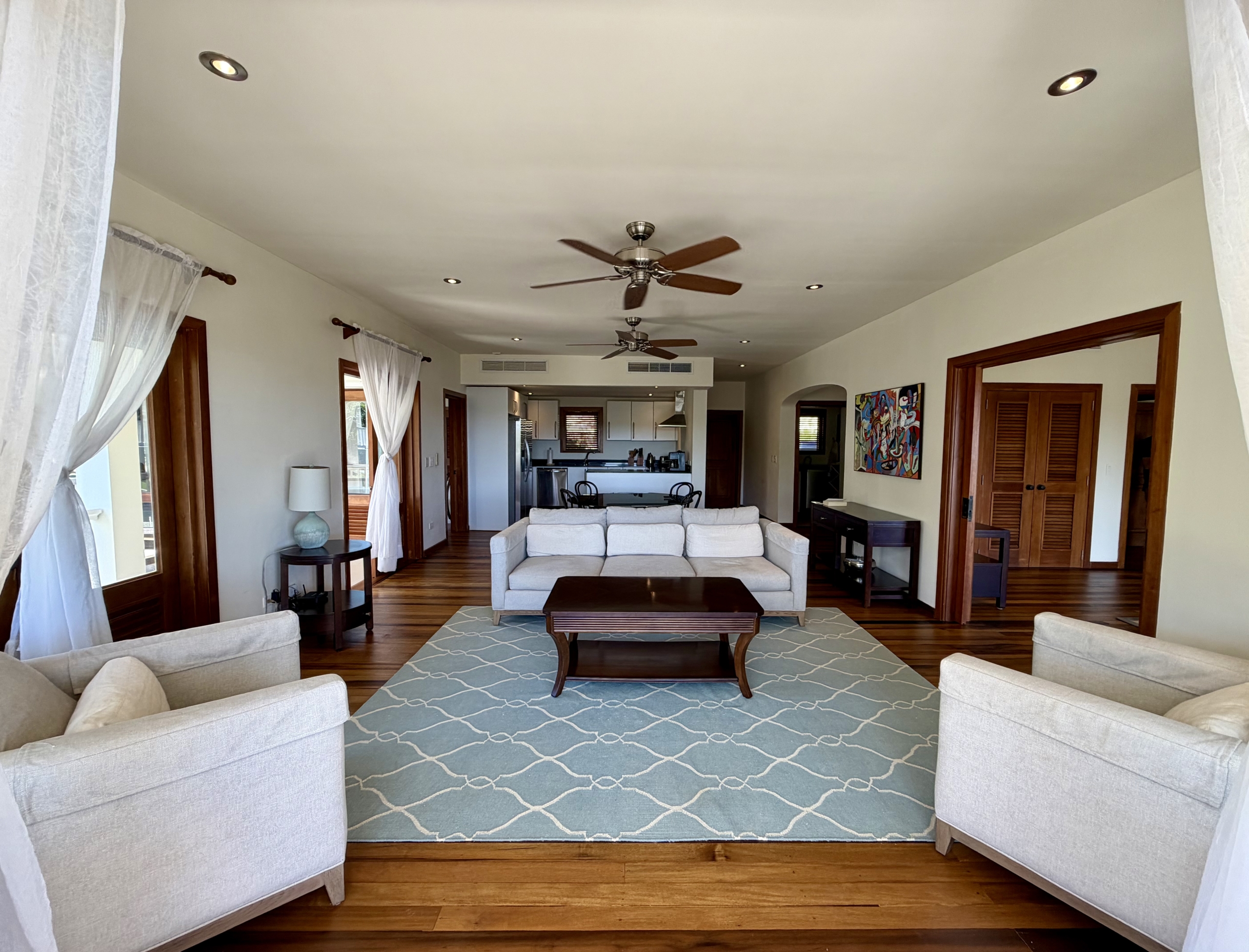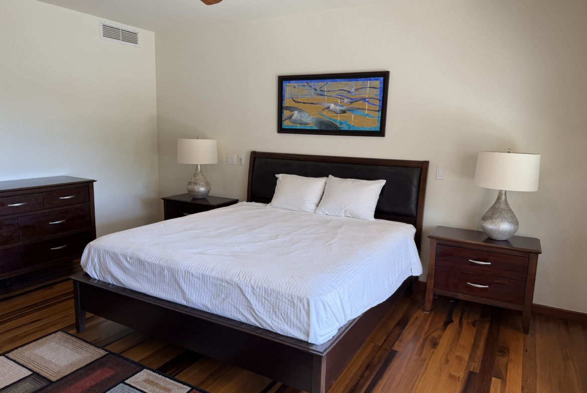 Ideally situated near the upper pool with a landscaped garden in front, the apartment provides a modern open and spacious living/dining areas and fully equipped kitchen with stainless steel appliances, as well as the expansive verandah set up for outside dining and lounging – perfect for relaxing or entertaining. Central air conditioning, purple heart floors, soaring ceilings, large closets, commodious baths, high end appliances and included Anglo-Indian style furnishings are some of the copious amenities.