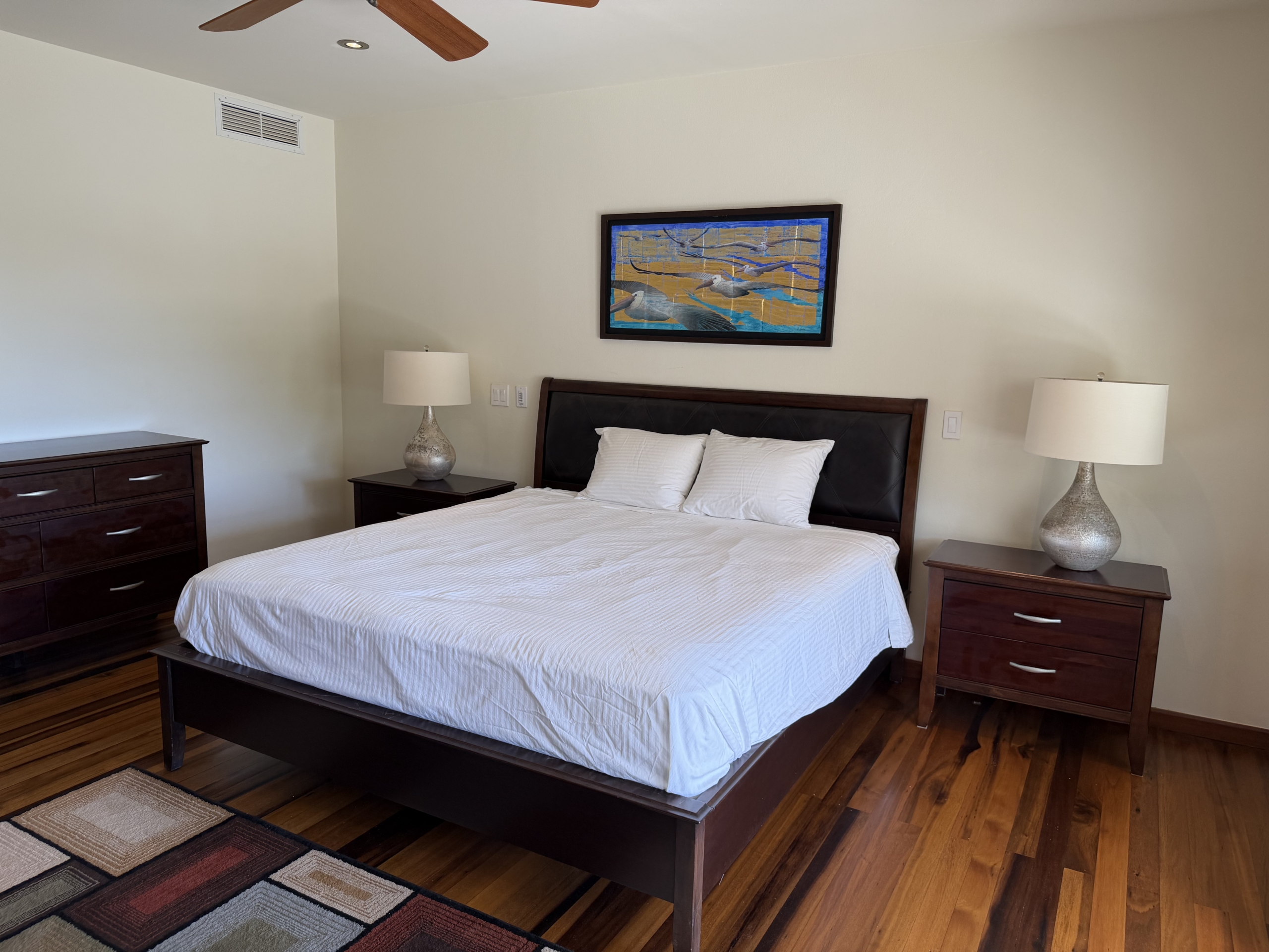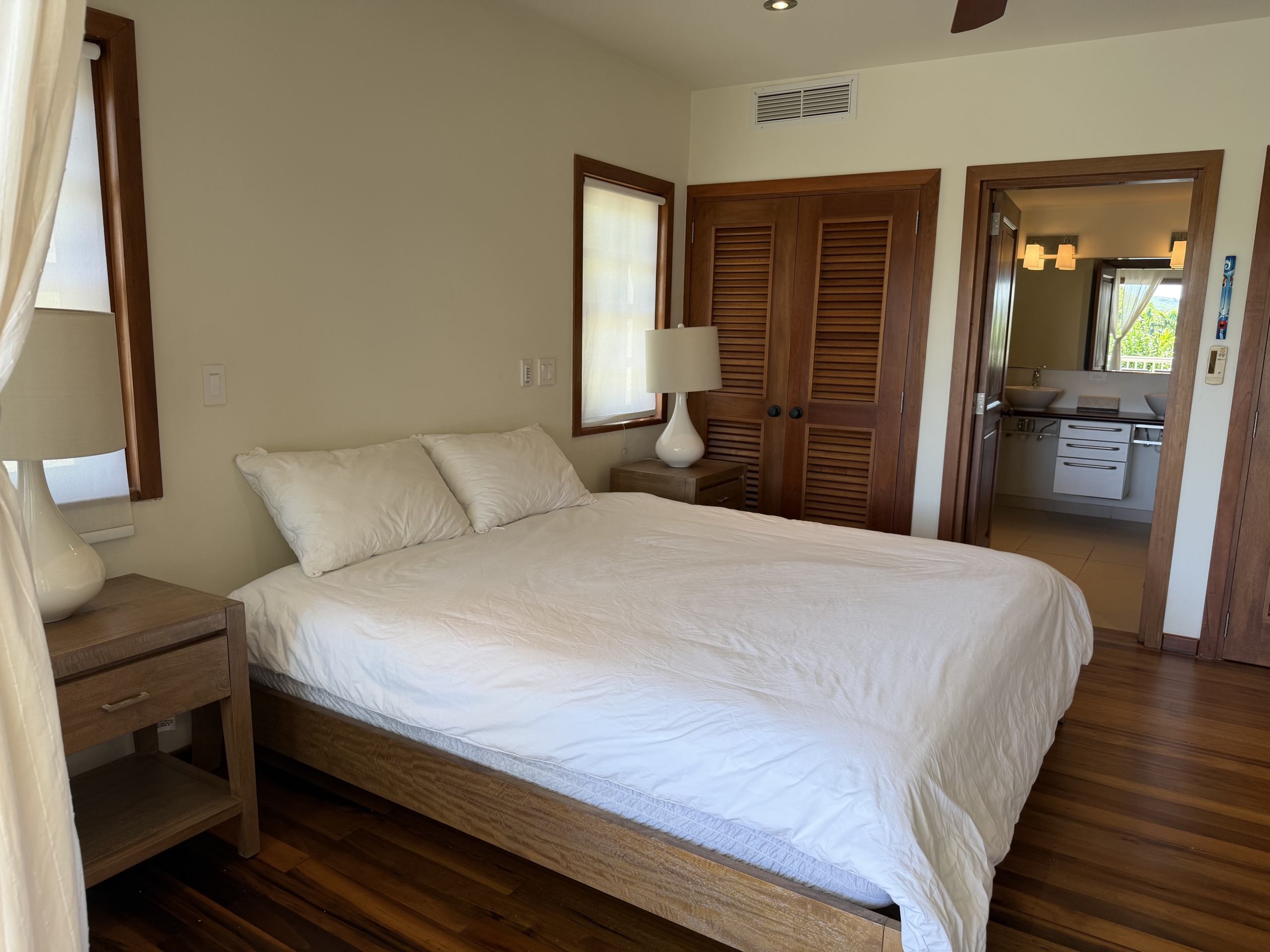 The apartment is located all on one level and on entering you are greeted with the open plan living area of lounge, kitchen, dining room opening out to the cool and breezy covered patio. To one side there is a king bedroom and ensuite bathroom with its own private patio . Off the main living room is bedroom two which has the house bathroom immediately on the opposite side of the corridor. The current owners are using this room as a multi use, second lounge with office space and an occasional third bedroom with sofa bed. The master boasts a king bed and access to the main covered patio king with a spacious en suite bathroom, with stunning views across the bay. All the bedrooms are cooled with ceiling fans and have air conditioning.