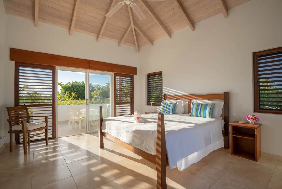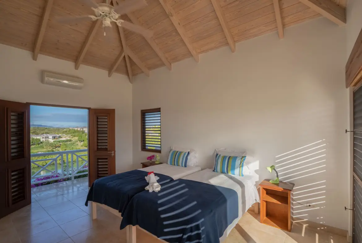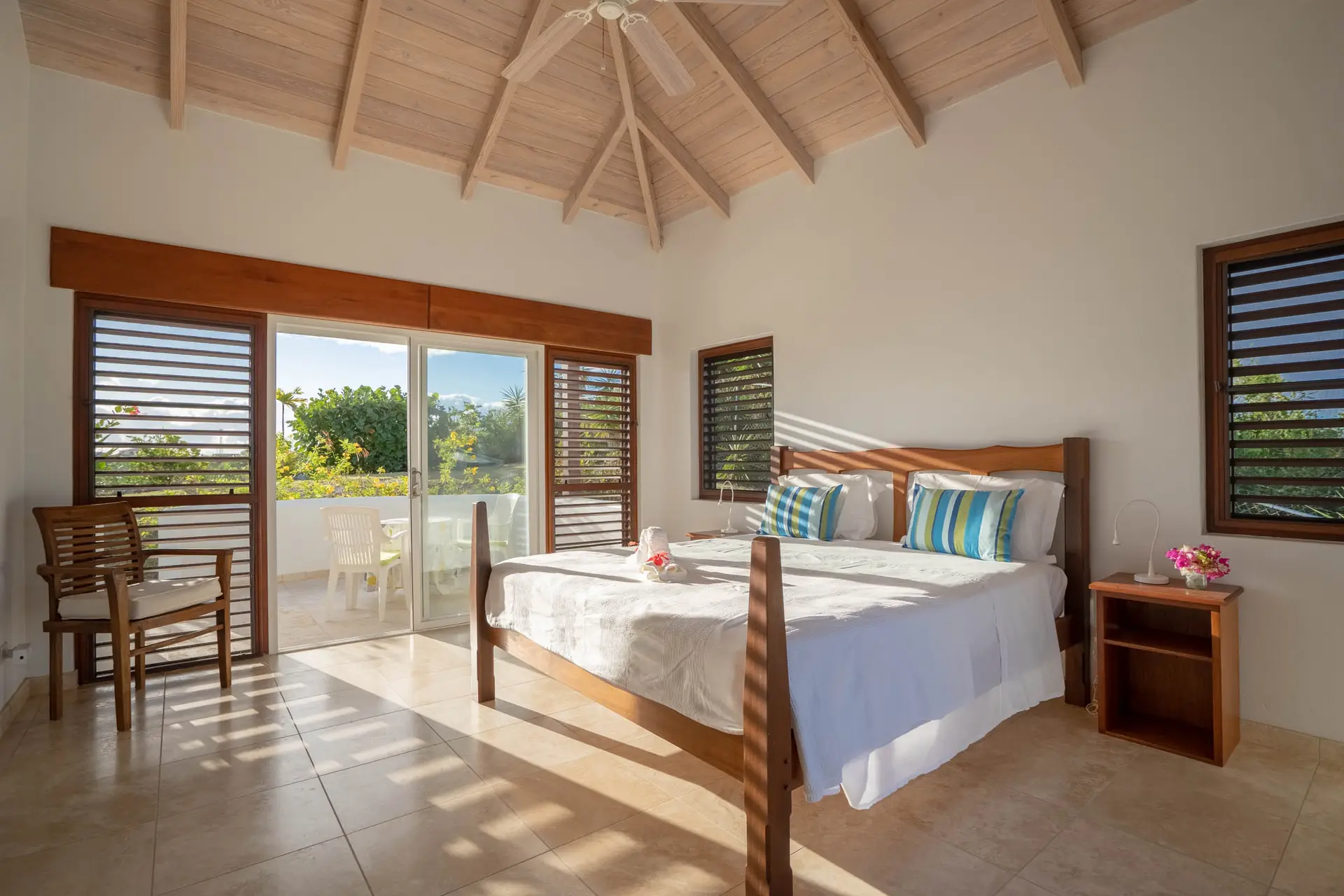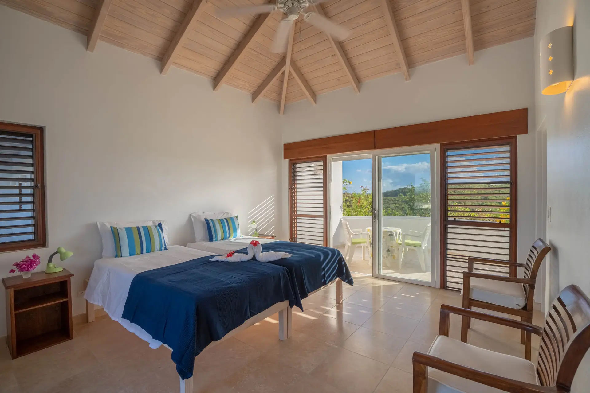 The wing also hosts three additional, generously sized bedrooms. Two feature twin beds and the fourth bedroom offers a second king bed. All three come complete with their own en-suite bathrooms and fitted or walk-in closets. Every bedroom is equipped with both air conditioning and ceiling fans. However, thanks to the villa’s ideal location, the ever-present sea breezes often make the air conditioning redundant, save for the warmest summer evenings. A key feature of the wing is that each bedroom enjoys individual access to the outdoors via sliding doors that open onto its own private covered patio space.