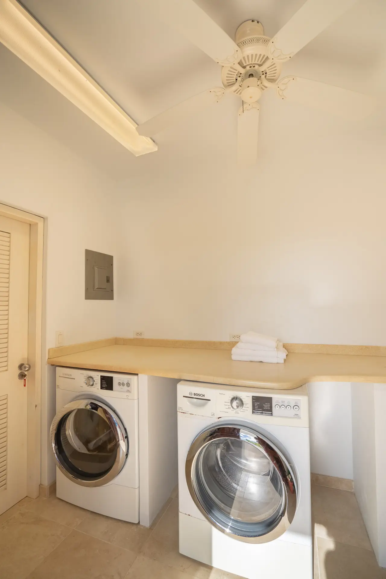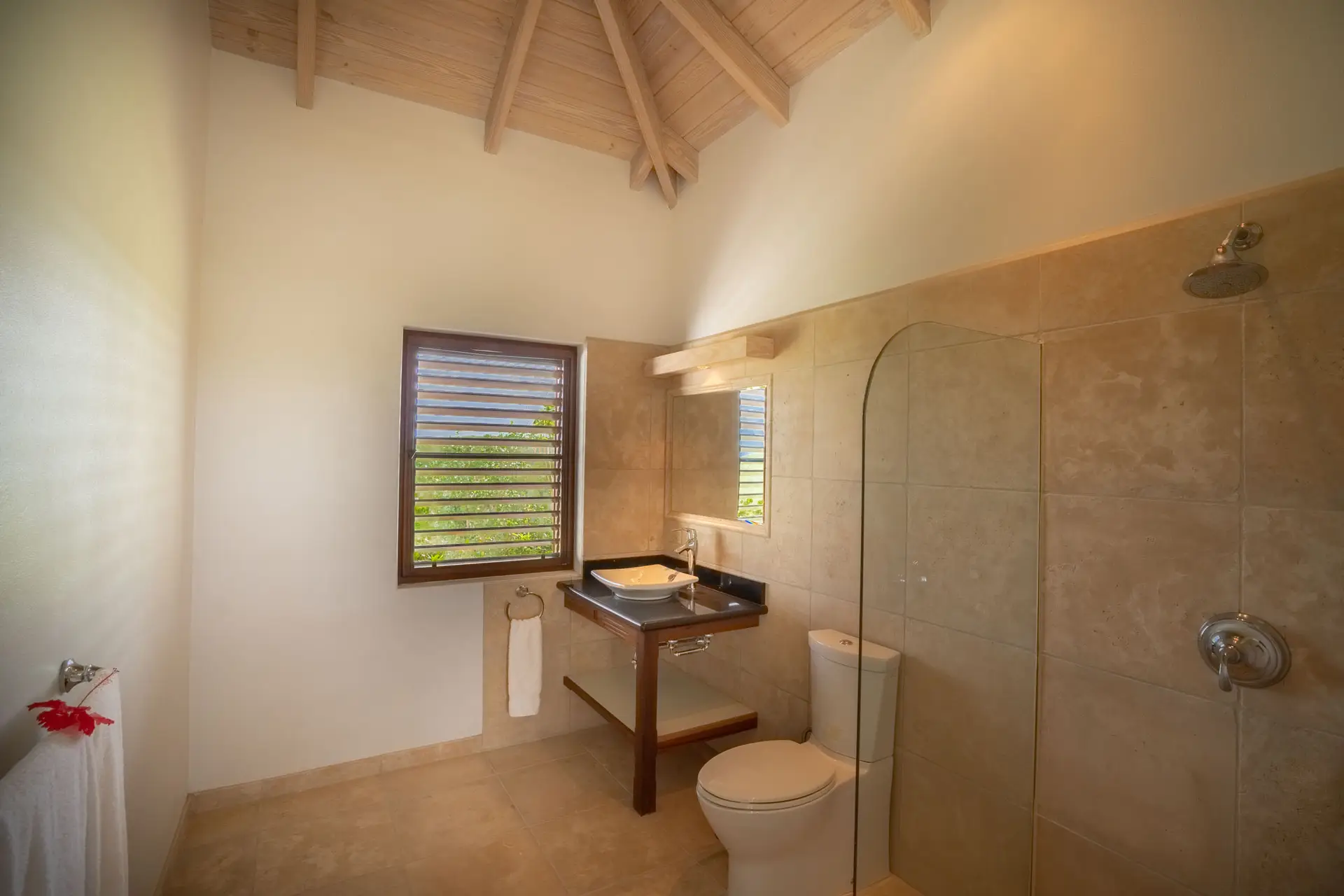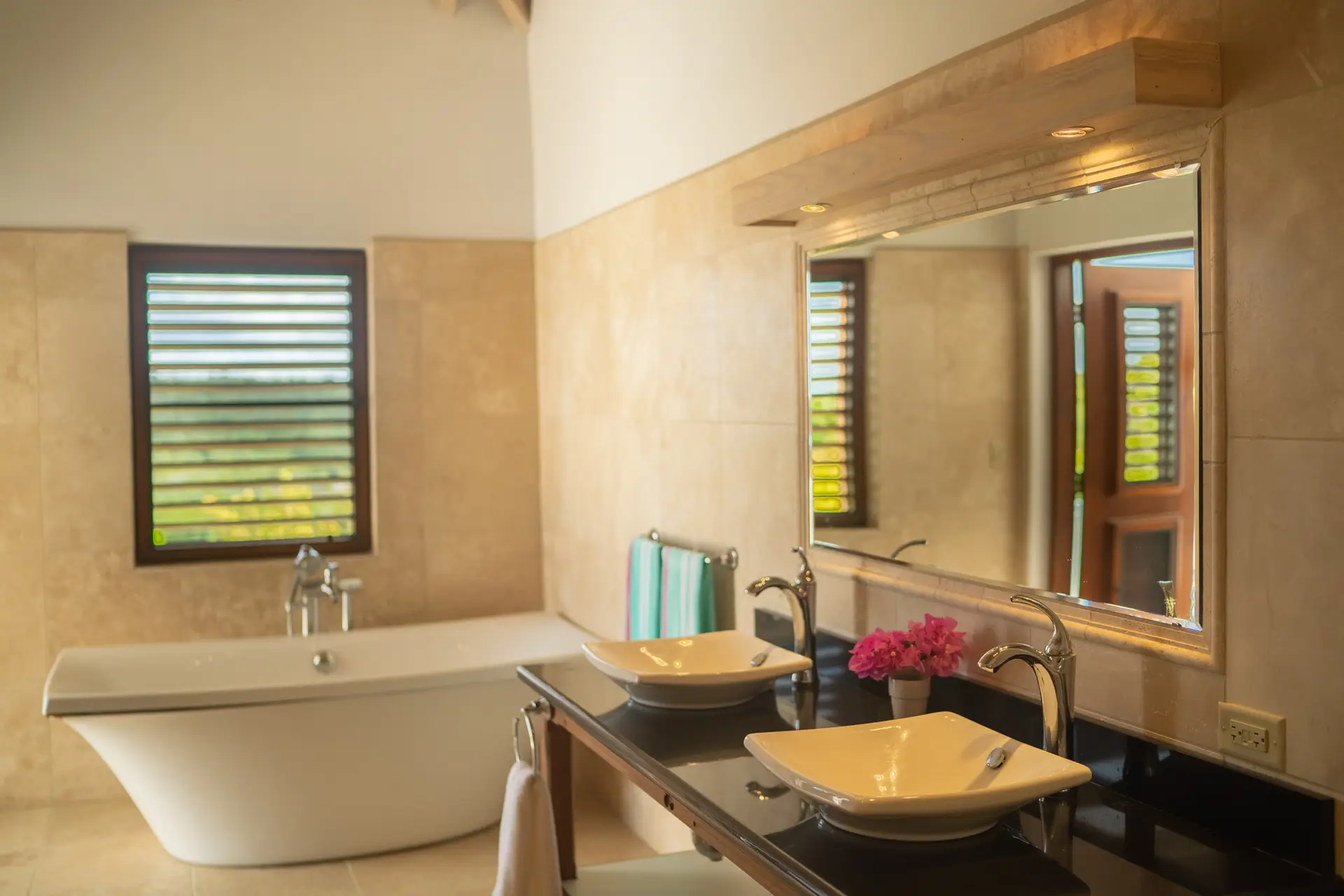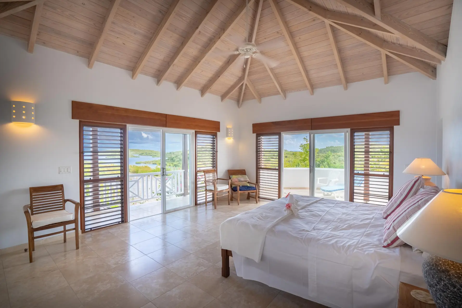 The wing also hosts three additional, generously sized bedrooms. Two feature twin beds and the fourth bedroom offers a second king bed. All three come complete with their own en-suite bathrooms and fitted or walk-in closets. Every bedroom is equipped with both air conditioning and ceiling fans. However, thanks to the villa’s ideal location, the ever-present sea breezes often make the air conditioning redundant, save for the warmest summer evenings. A key feature of the wing is that each bedroom enjoys individual access to the outdoors via sliding doors that open onto its own private covered patio space.