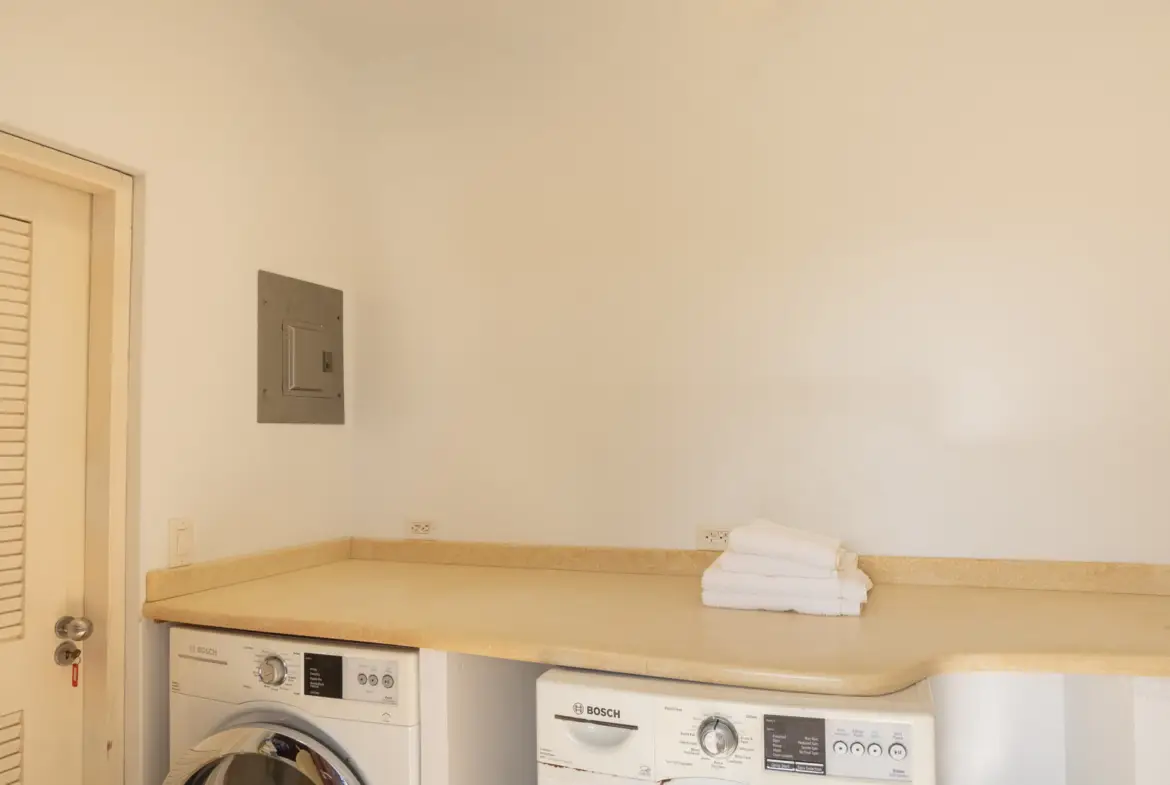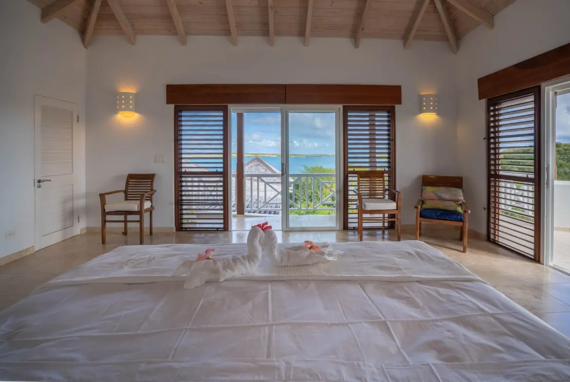 Unwind in the stunning master bedroom, featuring a king-sized bed and truly grand views over the bay. This suite includes a spacious en-suite bathroom and ample closet space, plus the benefit of its own private covered patio and an additional balcony.