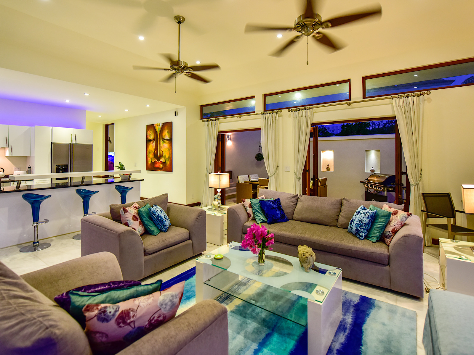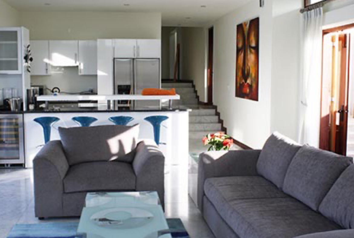 This architect designed luxury villa has 3 spacious en-suite bedrooms all with showers and stunning views. Two double bedrooms with en-suite bathrooms, love seats on balcony There’s a media room, office or playroom to the rear of the villa. The 3rd bedroom is in a separate self-contained guest suite. The spacious living room and kitchen area leads out to the infinity edge pool and elevated massage pool.